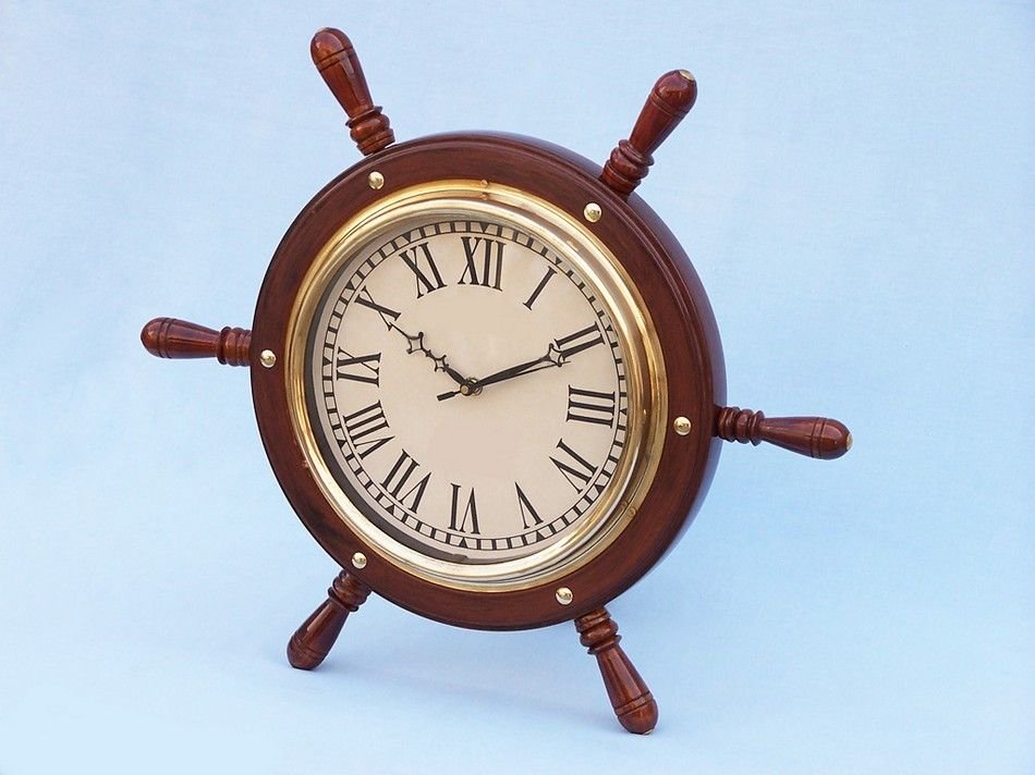This Solid Wood & Brass Ship Wheel Clock 15" adds sophistication, style, and charm for those looking to enhance rooms with a nautical theme. Our replica ship wheels have distinct and clearly visable wood grain. This unique design combines the classic wood grain with metallic brass accents to bring out a true nautical masterpiece. In the center of the wheel is a fully functional clock which rests perfectly inside the steering wheel.