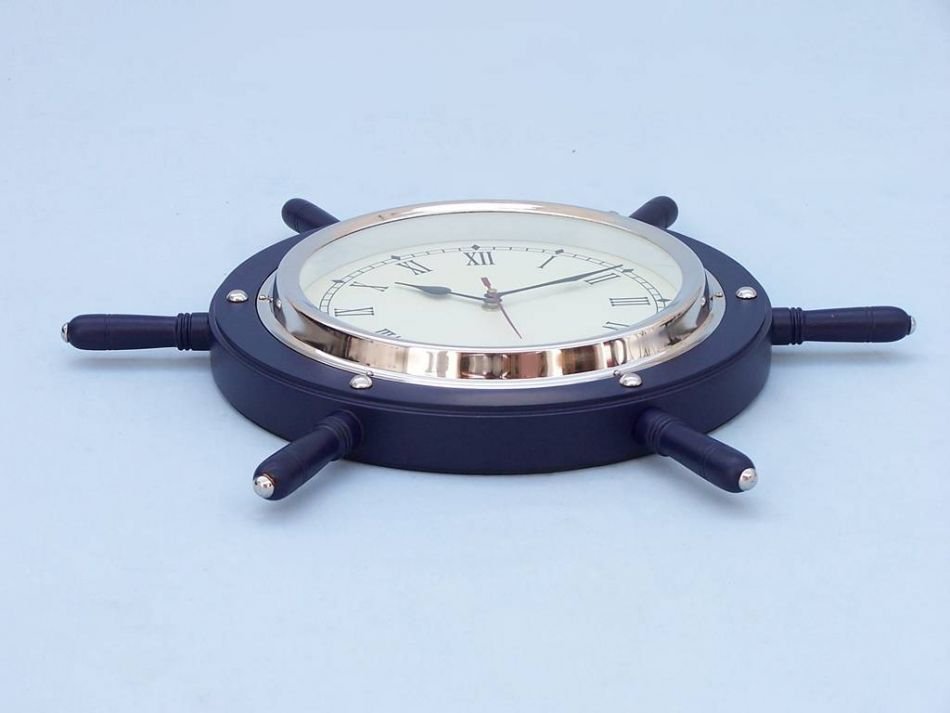 This Solid Wood & Brass Ship Wheel Clock 15" adds sophistication, style, and charm for those looking to enhance rooms with a nautical theme. Our replica ship wheels have distinct and clearly visable wood grain. This unique design combines the classic wood grain with metallic brass accents to bring out a true nautical masterpiece. In the center of the wheel is a fully functional clock which rests perfectly inside the steering wheel.