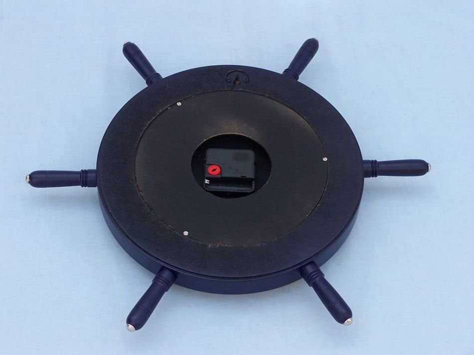 This nautical clock requires AA batteries to operate (not included) which can easily be installed in the back. There is also a hinge on the back of the ship wheel to make it very easy to hang on any wall.