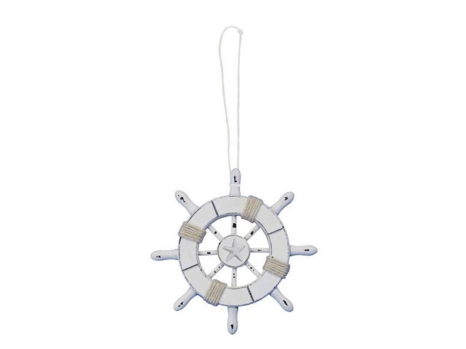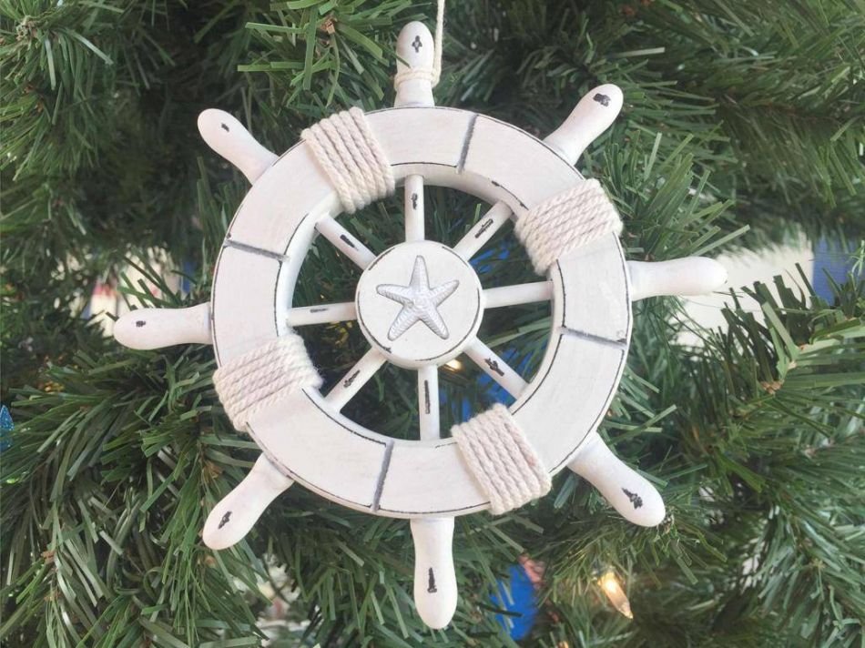 This White Decorative Ship Wheel With Starfish Christmas Tree Ornament 6" is perfectly combined with the warmth of the holiday season and the nautical lifestyle.  This ship wheel ornament decoration will light up any tree and adds the final nautical touch your Christmas needs. This charming boats steering wheel ornament has eight spokes and can be easily hung onto any Christmas Tree.