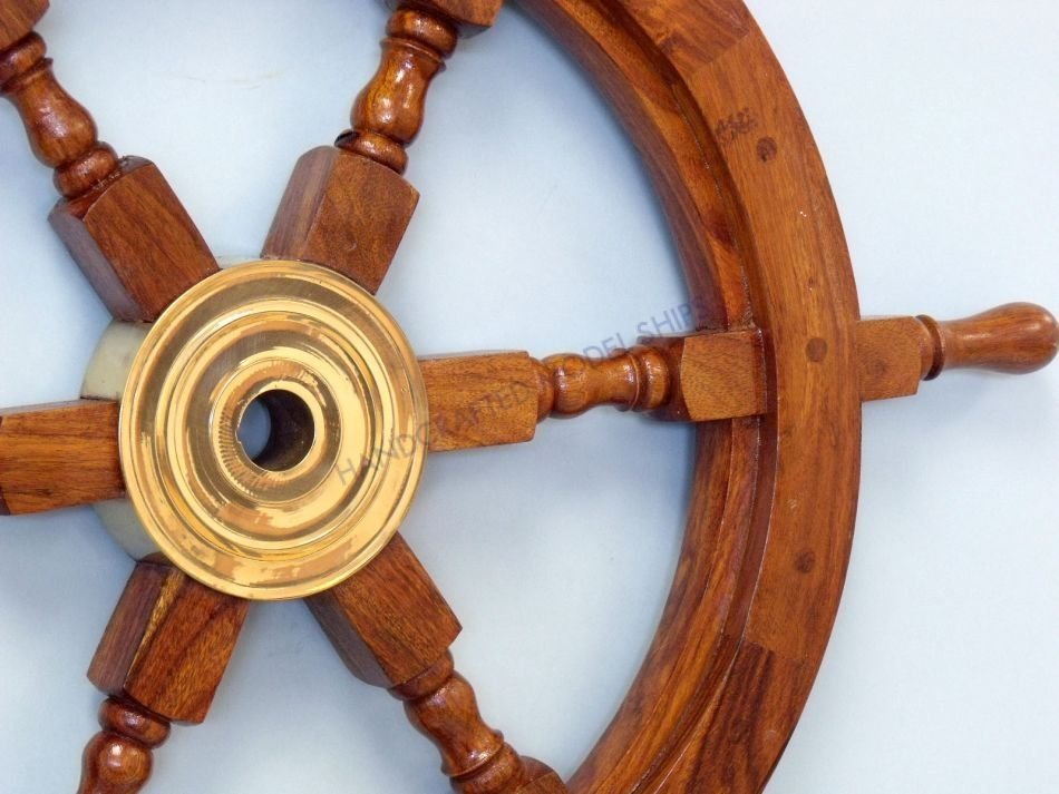 Made from rare, high quality Shisham wood which is hard, strong and is highly regarded for its ability to resist the elements.  The decorative wooden ship wheel has six spokes, each skillfully turned and assembled with plugged screw heads. The brass center hubs have uniform sizes holes and machined keyways.