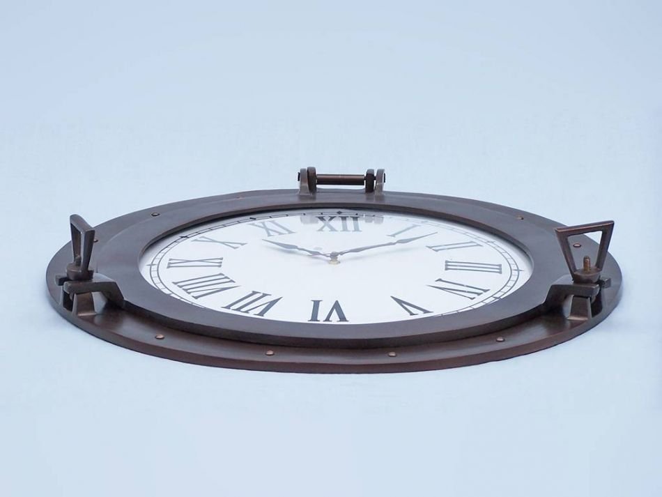 The Antique Copper Deluxe Class Porthole Clock 8" is a classy and quality accent piece to add to any nautical themed room. This charming vintage nautical port hole clock is both functional and stylish. This beautifully hand-painted vintage finish will accent your nautical wall decor perfectly. In addition, this Antique Copper Deluxe Class porthole clock opens just as if it were on a ship of the time.  Batteries not included.