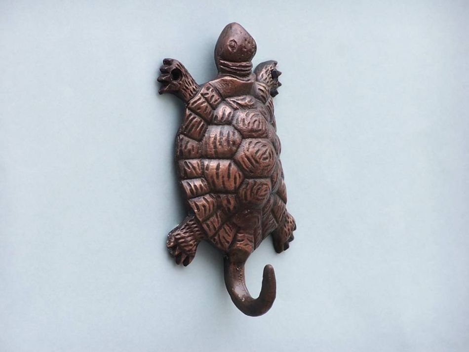 This Antique Copper Turtle Key Hook 6" is the perfect addition for any nautical themed home. Handcrafted from aluminum, this hook allows for easy decorative mounting, ideal for hanging clothes and accessories. Display this decorative hook to add a nautical theme to any room and show those who visit your home your affinity for the nautical sea-faring lifestyle.