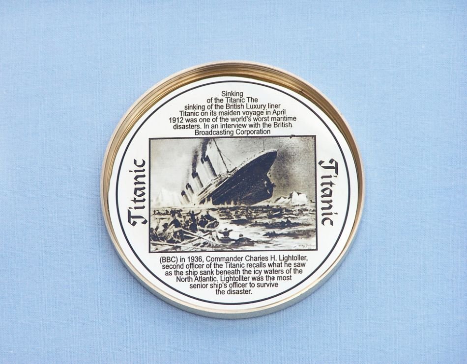 The commemorative RMS Titanic Brass Compass is truly a great gift to any nautical enthusiast in your life. This 4-inch in diameter compass features a solid brass body and face with a gorgeous finish. Inside the top lid shows an etched image of the famous shipwreck with a few sentences commemorating the sinking of the RMS Titanic. This compass also has a sundial compass heading and is a great instrument for any nautical explorer.  The compass rose is graduated in degrees and has a standard surveyor's 0 - 90 degree scale from North and South.