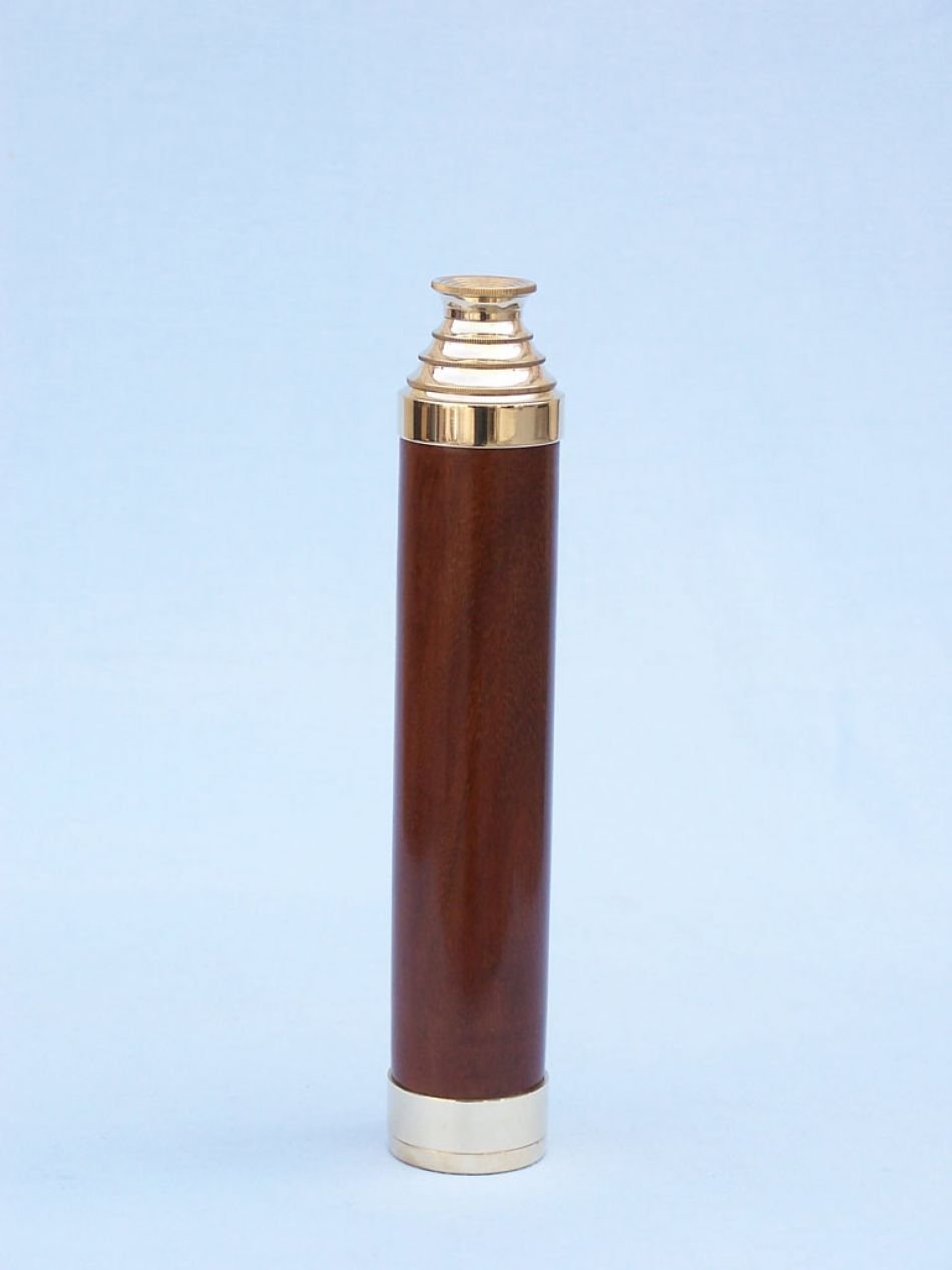 The Hampton Nautical Premium Quality 25" Brass Spy Glass Telescope is a great gift for a nautical navigator in your family. The spy glass measures 25" when its four brass tubes, which are clear coated to protect the brass from tarnishing, are fully extended. The spy glass is 9"  when collapsed and features a smooth, solid wooden handle and a solid brass cap to protect the lens. Simply push in or pull out the eyepiece to bring the image into clear focus.