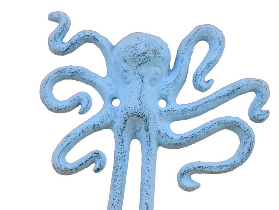 This Rustic Dark Blue Whitewashed Cast Iron Wall Mounted Octopus Hooks 6" is the perfect addition for any nautical themed home. Handcrafted from cast iron, this octopus with hooks allows for easy decorative mounting, ideal for hanging clothes and accessories. Display this decorative piece to add a nautical theme to any room and show those who visit your home your affinity for the nautical sea-faring lifestyle.