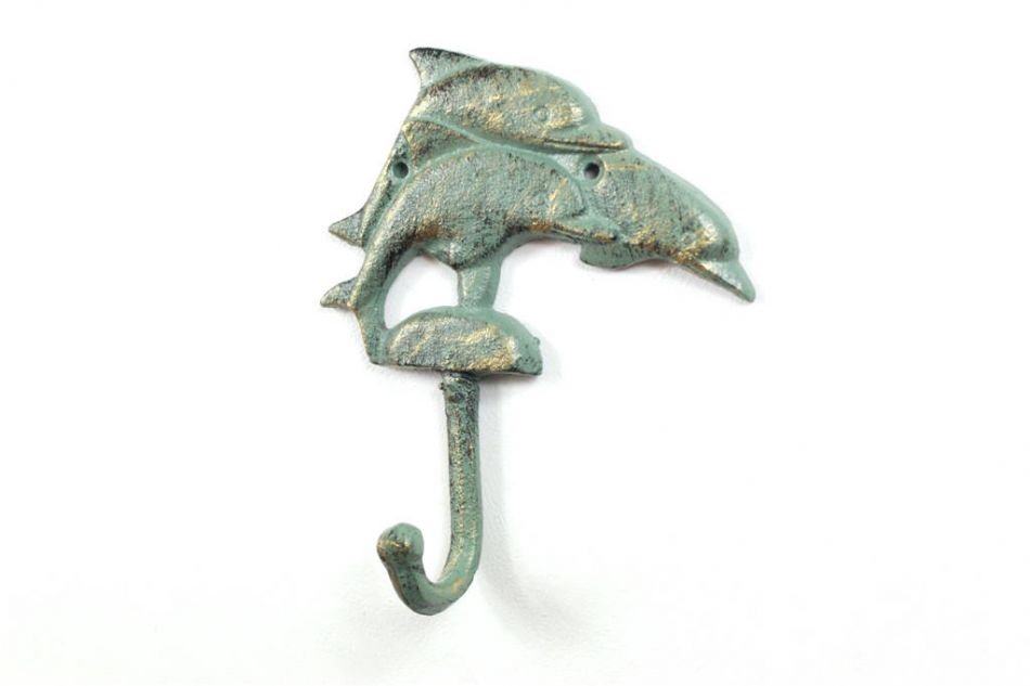 This Antique Seaworn Bronze Cast Iron Dolphins Wall Hook 6" is the perfect addition for any sea life themed home. Handcrafted from cast iron, this hook allows for easy decorative mounting, ideal for hanging clothes and accessories. Display this decorative hook to add a sea life theme to any room and show those who visit your home your affinity for the sea-faring lifestyle.