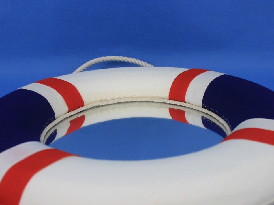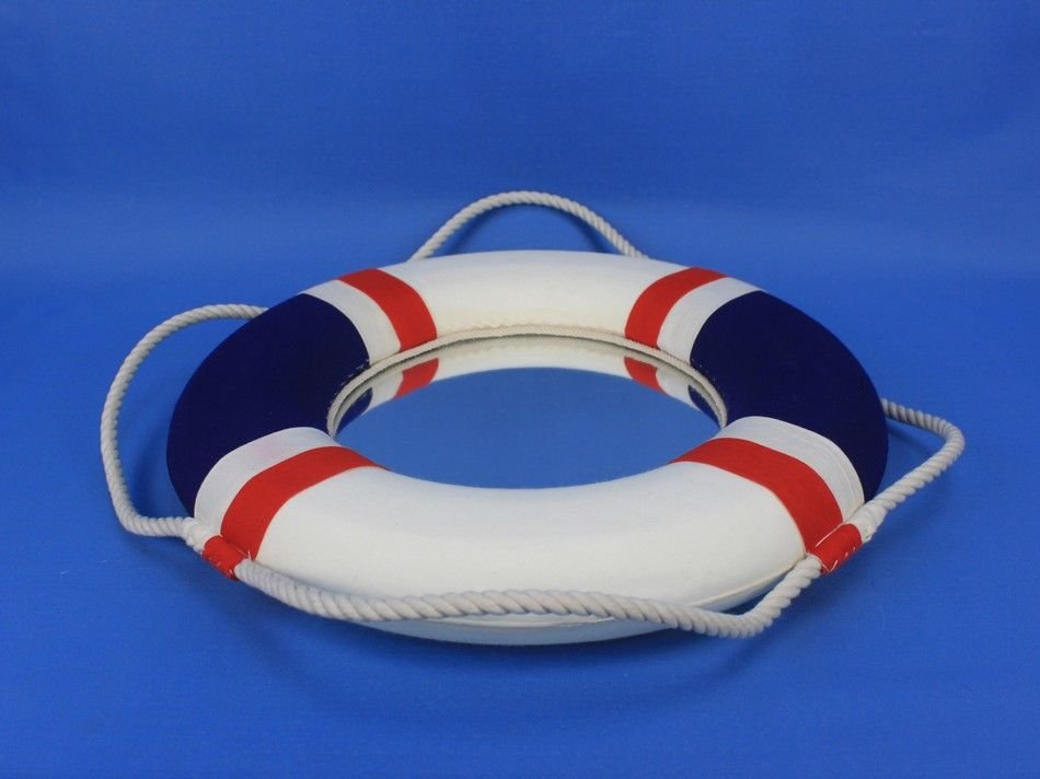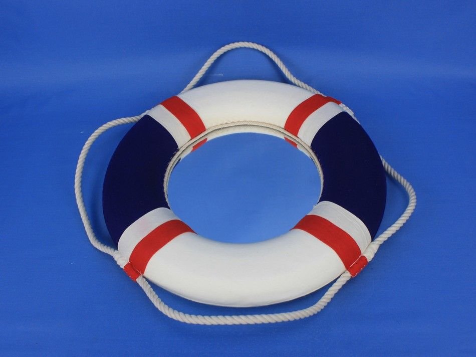 • Prominent white rope and red bands contrast the dark blue and white finish of the life preserver decoration