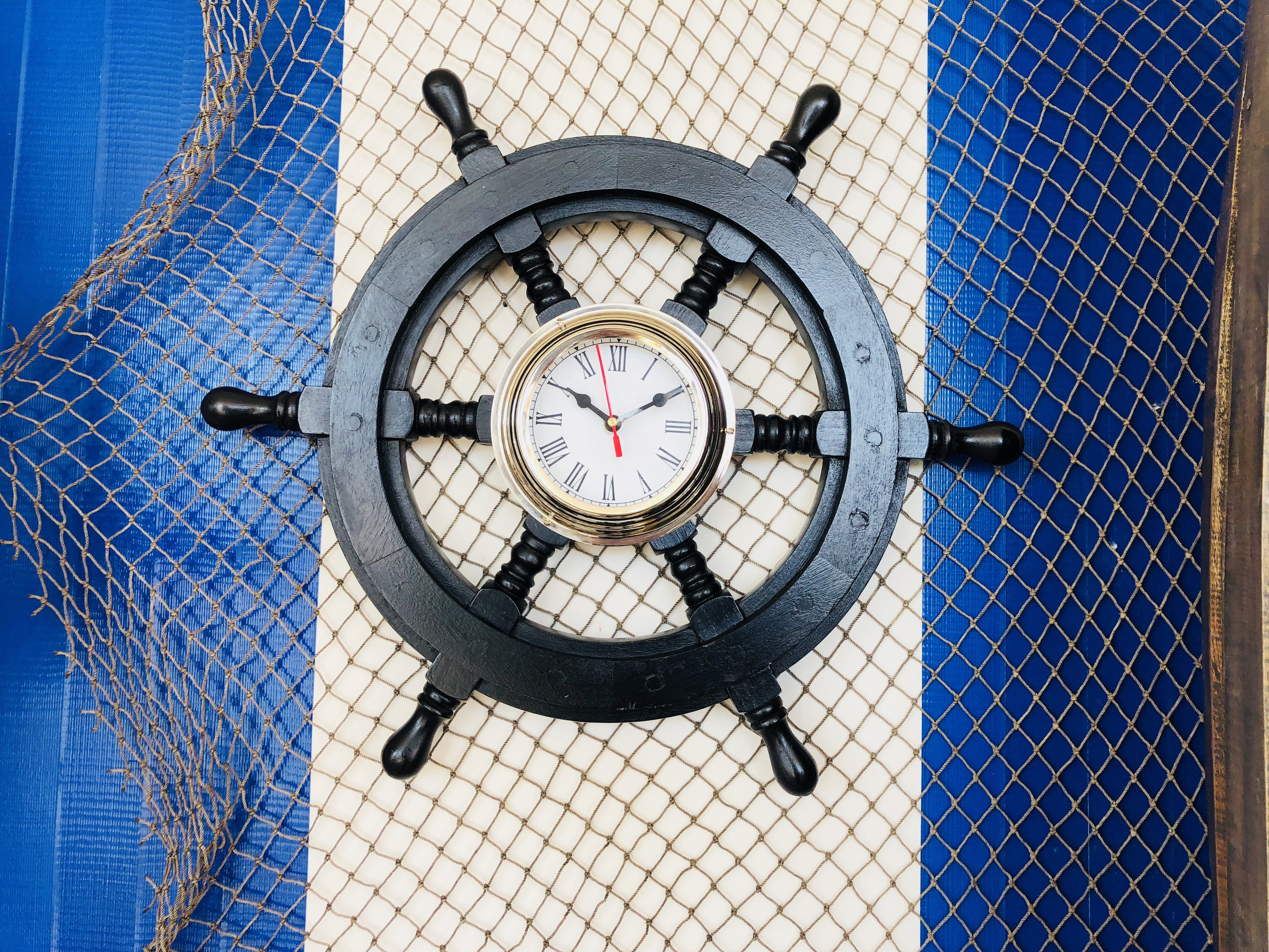 This wooden ship wheel clock requires AA batteries to operate (not included) which can be easily installed in the back.