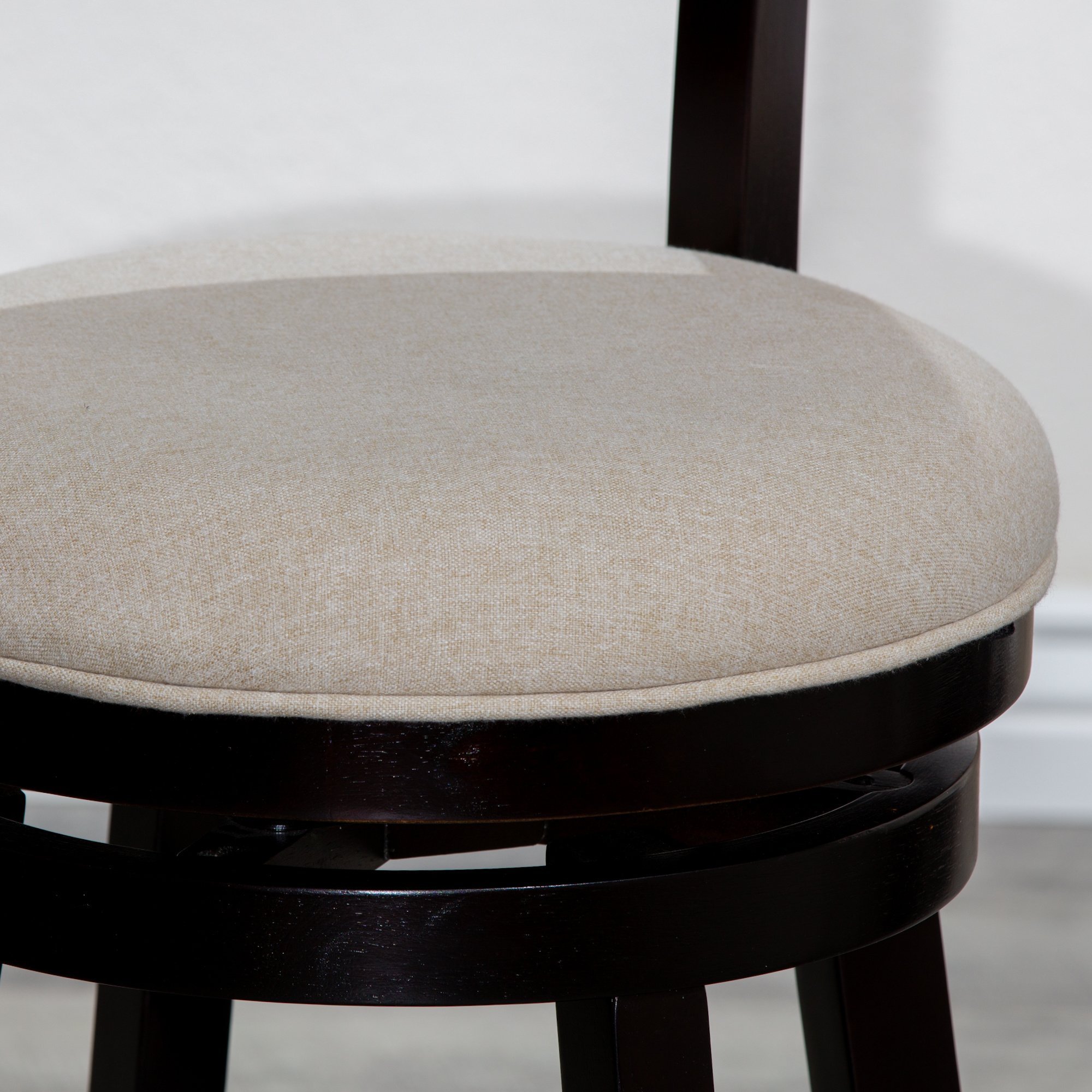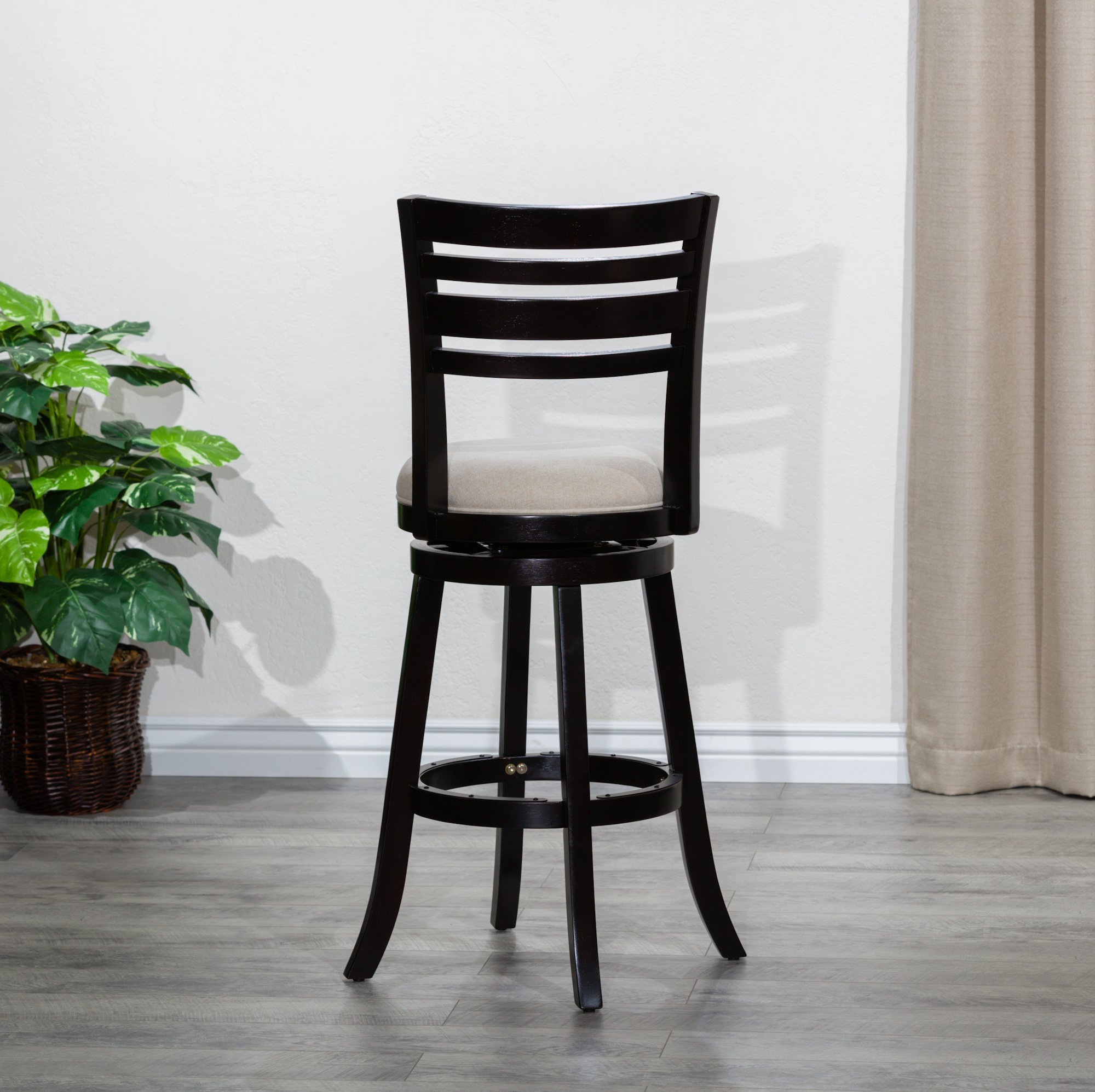 30" Bar Height 4-Slat Back Swivel Stool, Espresso, Beige FabricImpress your guests with this swivel slat back stool. These fashionable stools are comfortable and sturdy. The slat back design is complemented by the padded bonded leather or fabric seat and flared leg. These sturdy stools are built with a solid hardwood frame and a round footrest with metal plates to protect the stool from footwear damage. This stool is available in two sizes, four finishes and a variety of seat colors. This bar stool is sure to add a sophisticated touch that complements any décor.