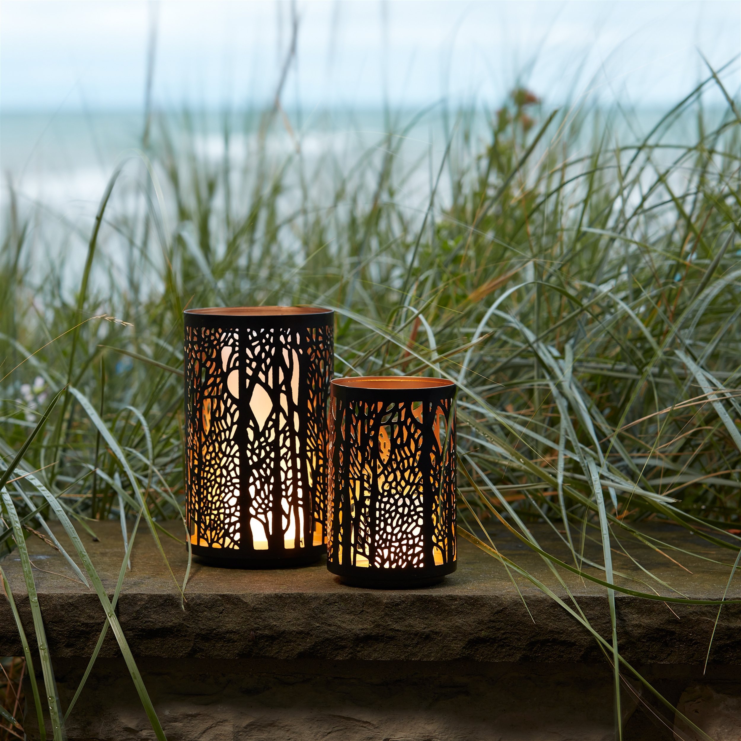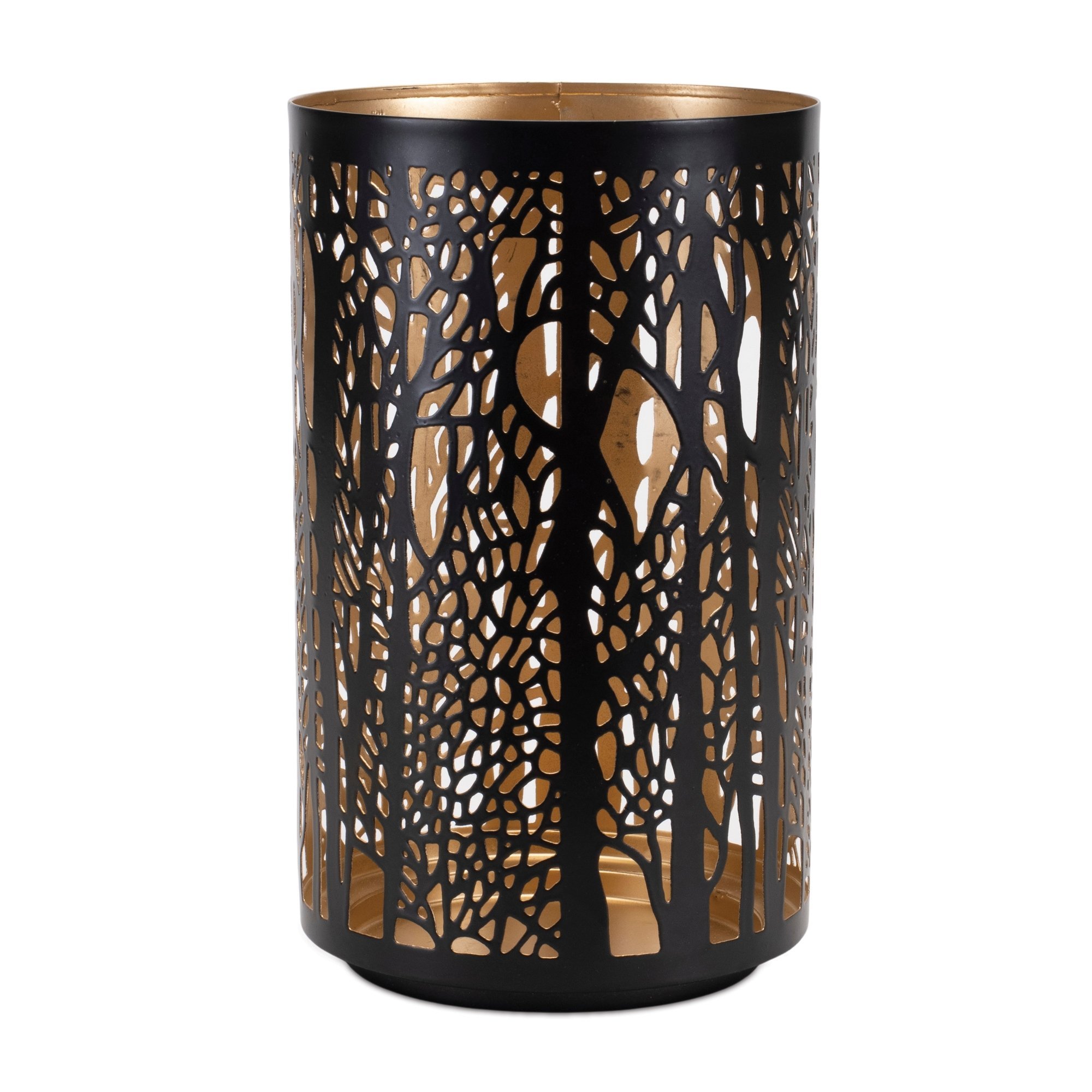 Add a serene ambiance to your home with this beautiful set of Punched Metal Candle Holders. Featuring two assorted sizes, this set is a great fit for your contemporary or modern style of decor. The cool black tones paired with the tree forest cut-out design and gold accent is the perfect combination to create a stunning display. The quality iron metal composition is sure to last for seasons to come. Illuminate the set by adding a real wax or LED candle to each holder. Candles sold separately, the set best fits a 3-4" pillar candle.