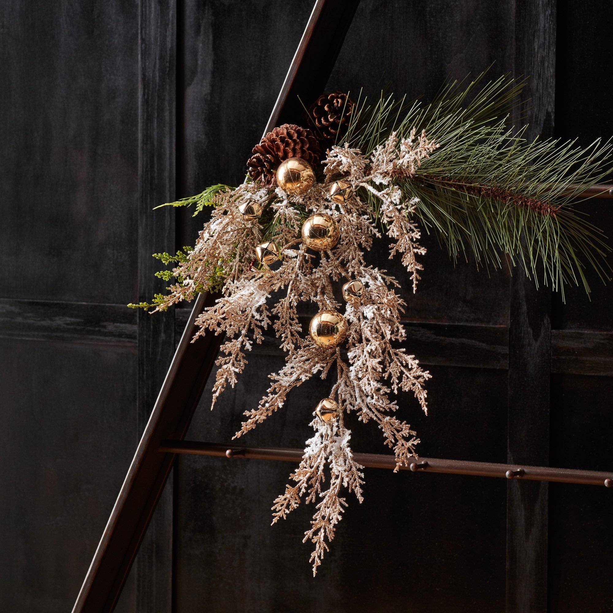 Add a touch of nature to your home with this stunning set of Hanging Pine Sprays. The wintry white and gold tones paired with the realistic flocked finish and unique hanging design are the perfect combination to create a memorable holiday display. The quality plastic and iron wire composition is sure to last for seasons to come. Display the set in a tabletop vase to add height to your decor, or place them into a garland or wreath to accent the arrangement. Whether you're adding a touch of cheer to your home or gifting to a loved one, these pieces will definitely bring smiles to your home.