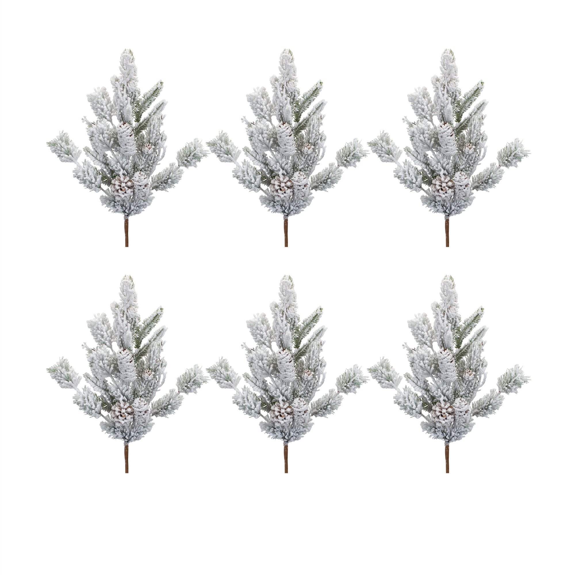 Add a touch of nature to your holiday decor with this beautiful set of Snow Pine Spray. Featuring 6 pieces, this set is a great accent to your Christmas tree, holiday porch pot, or tabletop vase arrangement. The wintry green and white tones paired with the snowy flocking accent is the perfect combination to create a memorable display. The quality plastic composition is sure to endure for seasons to come. Complete your holiday decor with this stunning set of Pine Sprays!