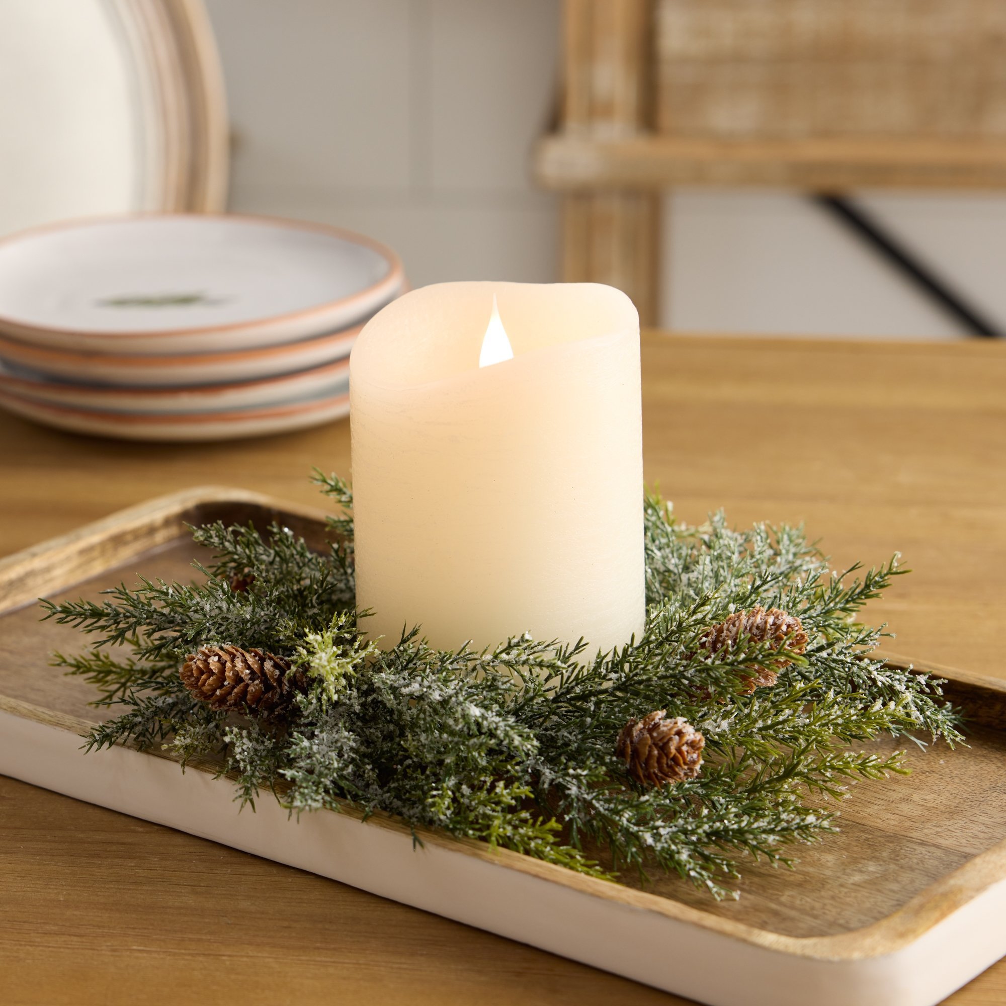Add a touch of nature to your tabletop holiday display with this stunning set of Pine Cone Candle Rings. Featuring natural green and brown tones and rustic pinecone accents, this candle ring is sure to fit right in with your holiday decor. The quality plastic compsosition is sure to endure for seasons to come. Illuminate the piece by adding a real wax or LED candle to the center of the ring. Fits up to a 4" pillar candle, not included.
