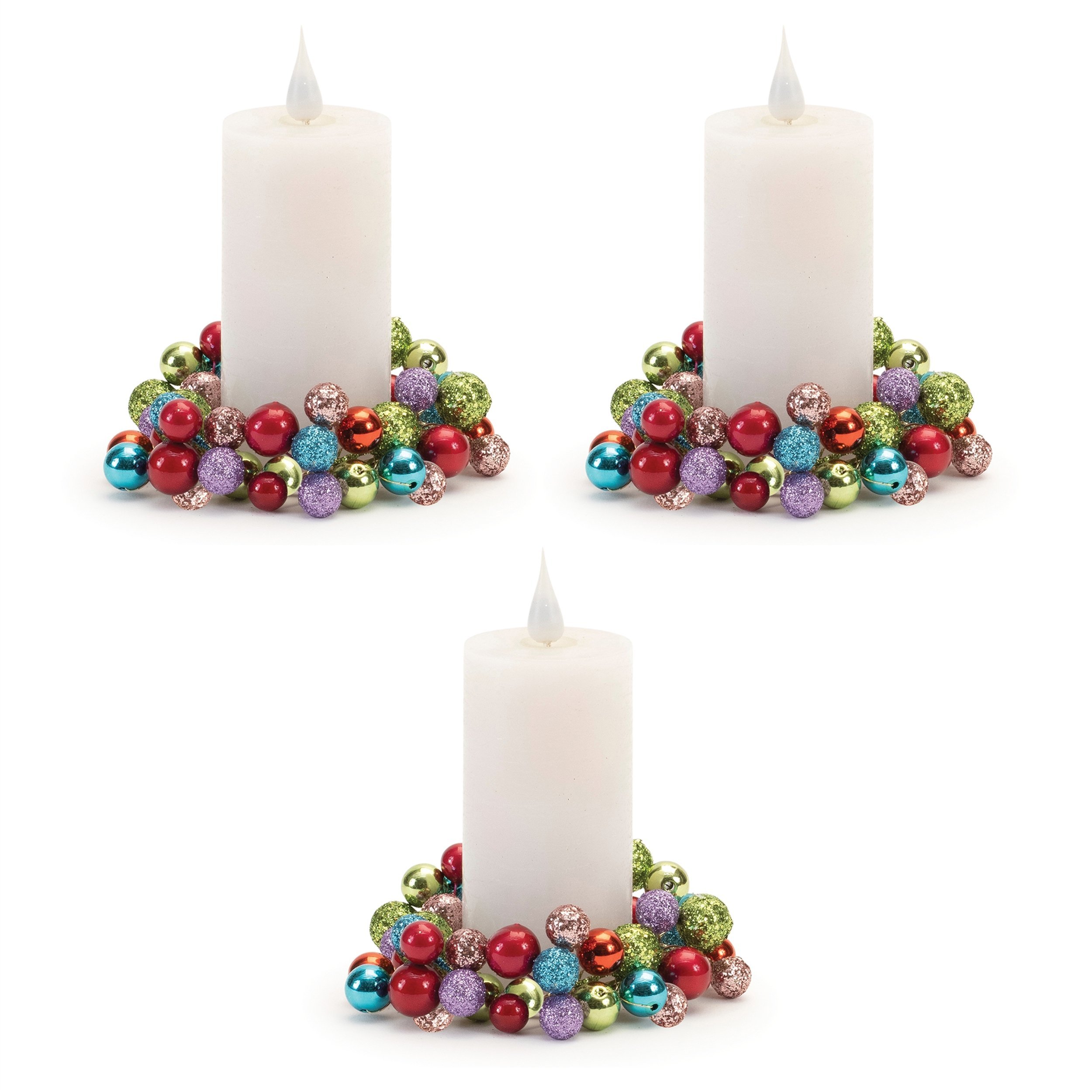 Ring in the holiday season with this festive set of Mini Ornament Candle Rings. Featuring three pieces, this set is a great fit for your traditional or chic style of holiday decor. The bright multi-colored ornaments paired with the clustered design and glitter accents are the perfect combination to create a memorable display. The quality foam and iron wire composition is sure to endure for seasons to come. Illuminate the display by adding a real wax or LED candle to each ring. Candles sold separately, this set best fits a 2" pillar or votive candle.