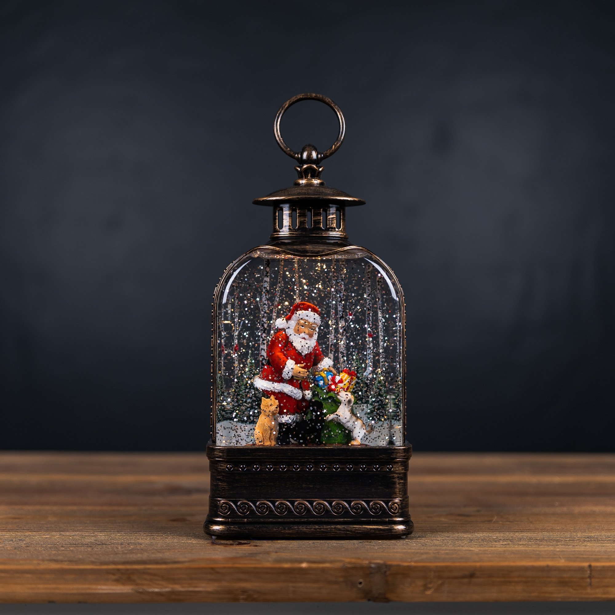 Illuminate your home this Christmas season with the stunning Lighted Lantern Snow Globe. This piece features a woodland Santa scene with deer and cardinal bird accents. The lantern design paired with the pine forest background and sparkley globe contents makes this set a great addition to any style of holiday decor. The piece also features a 6-hour timer function to save you the hassle of turning it on and off. A USB charging cord is included with purchase, and it can also be powered by 3 AA batteries (not included).