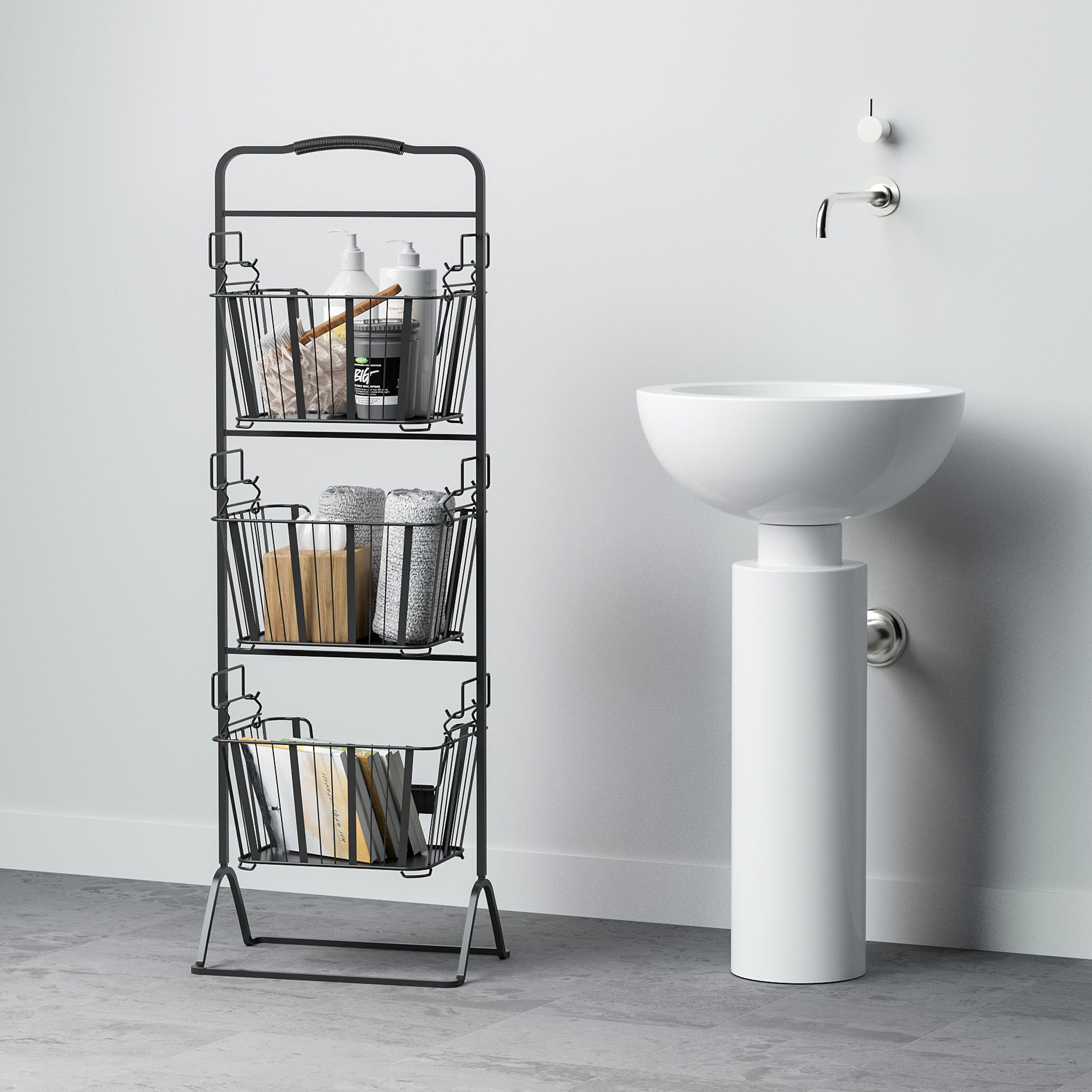 Elevate your home storage with these Wire Storage Baskets. This product is a stand with three tiers of removable wire baskets, perfect for holding and organizing all manner of items. Use them as wire vegetable baskets, or hold any sort of dry produce and snacks in them. The three tiers of shelving provide you with options on how to use the item, while the baskets being removable brings versatility to how and where you choose to utilize them. Whether you’re setting up your home vegetable stand, spice rack, or literature display, this is the unit for you. Get your home in order with these Wire Storage Baskets. The Wire Basket Stand with Removable Baskets is the perfect solution to your storage and organization needs. This organizer is great for storing and displaying dry produce, storage onion, potato, snack, bathroom accessories, pet toys, and more! Use this storage tower in your bathroom for easy access to beauty supplies and hand towels or your kitchen for produce and pantry staples.