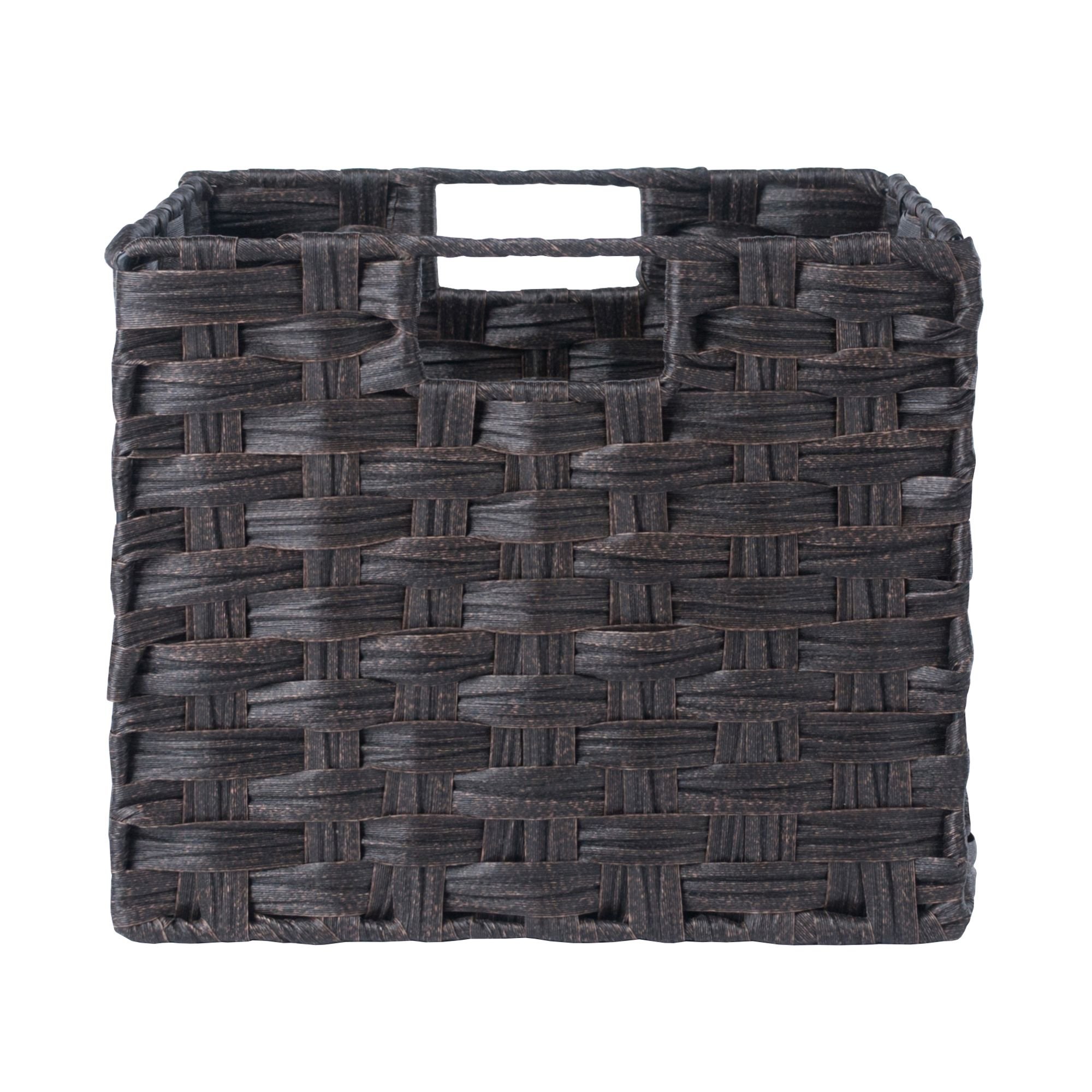 The Winsome Wood Melanie 3-piece Foldable Basket Set with 1 large and 2 small baskets makes it easy to organize anywhere with charm and style. Both the small and large baskets will fit standard bookshelf height and depth; ideal for managing toys; magazines; dishtowels; or simply keeping the clutter of odds and ends neatly out of sight. Woven in durable flat polypropylene; the baskets will stand up to a steamy bathroom  or lots of mileage in the kids' rooms. Just wipe clean with a damp cloth. And when not in use; they fold flat for easy storage. Cut-out handles on either side make them easy to move from place to place. Finished in a rich chocolate; these handy organizers will look great in either a contemporary or rustic farmhouse setting. Ships in one box; prompt up and ready to use. Also available in a 3-piece  or 2-piece set of small baskets.