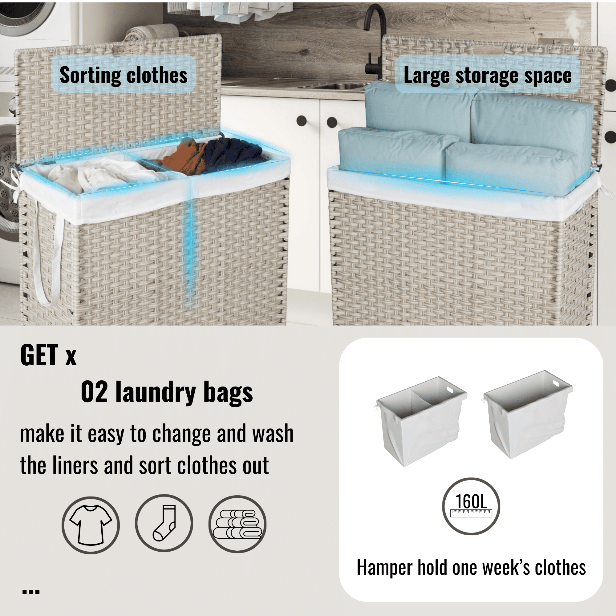 Home > Laundry Hamper With Lid PE Rattan Powder Coating Frame Clothes Hampers with 02 Removable Bags, Wheels, 160L, Grey Color