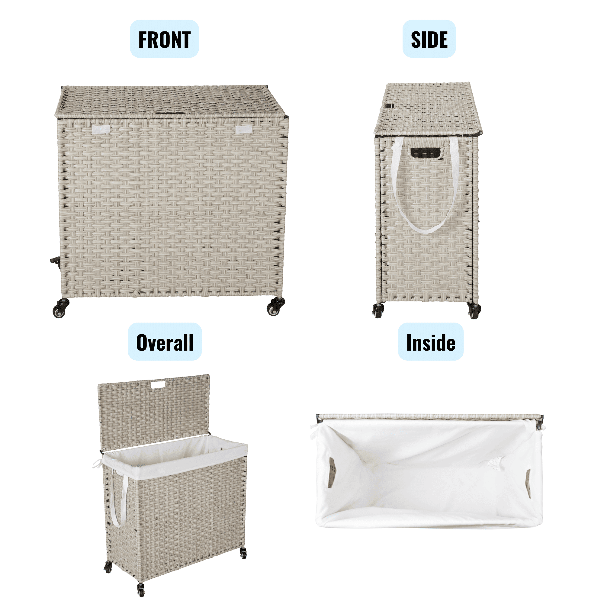 Laundry Hamper With Lid PE Rattan Powder Coating Frame Clothes Hampers with 02 Removable Bags, Wheels, 160L, Grey Color