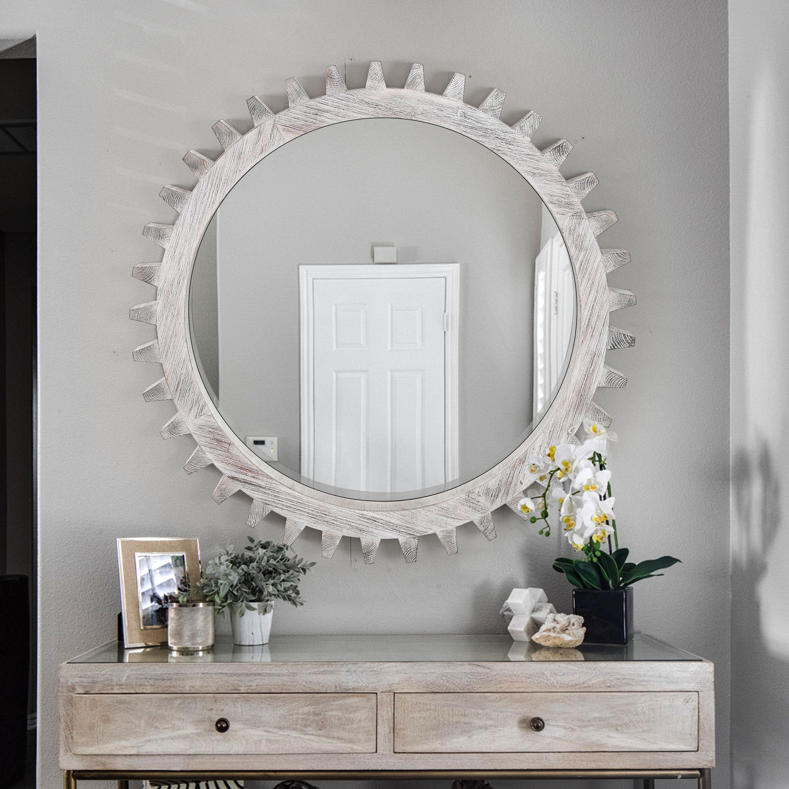 Home > Vintage Wood Round Hanging Gear Shape Heavy Decorative Mirror For Bathroom Living Room Entryway