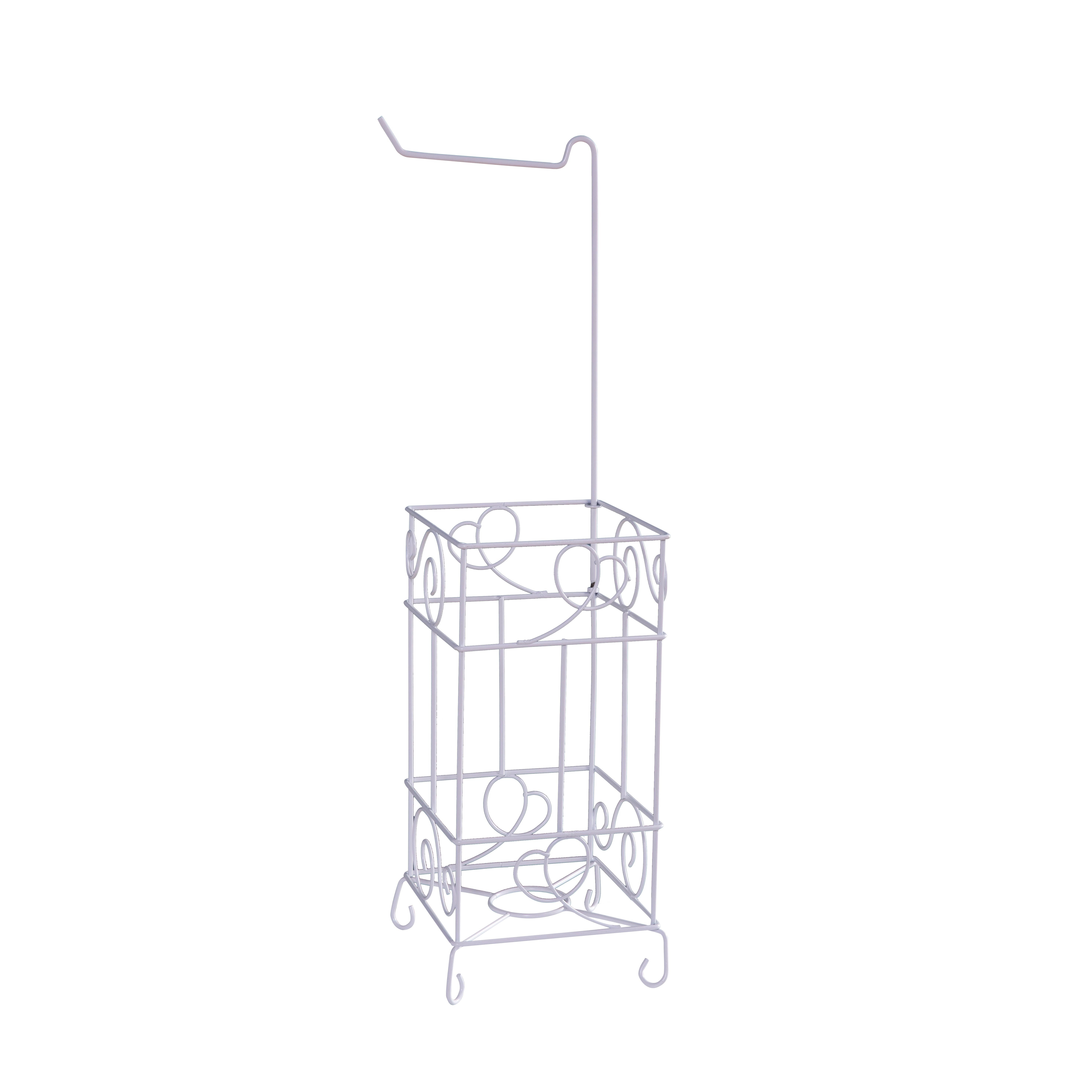 Keep your extra toilet paper rolls organized and within reach with this toilet paper holder stand. Add a toilet paper holder to your bathroom without drilling or damaging your walls. Sturdy metal frame is water resistant, features intricate metal design and stands high above the floor to minimize moisture retention. Dress up your bathroom with this toilet paper holder stand.