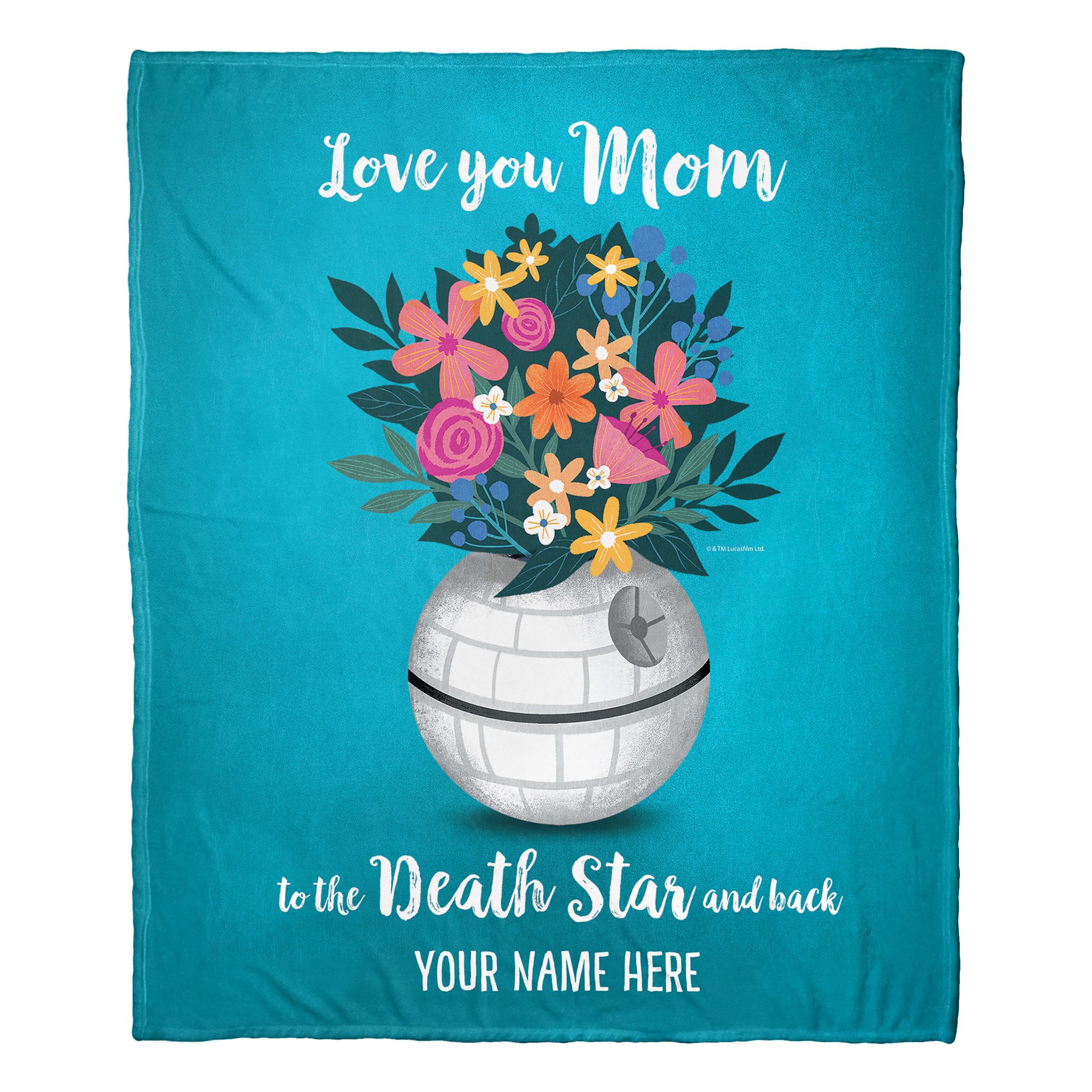 Features a Death Star vase filled with flowers and the words:"Love you Mom to the Death Star and back" and your unique personalization