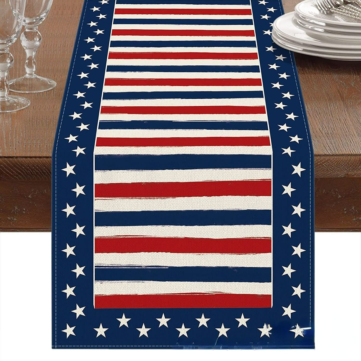 1PC Rectangle Linen Blend Striped Table Runners; Encryption Linen Home Decoration Independence Day Atmosphere Waterproof Table Runner; 72"*13"; Patrio