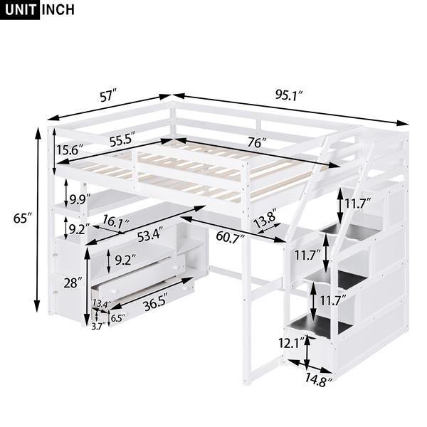 This white loft bed is designed with both functionality and style in mind. It features a built-in desk, shelves, and dresser for ample storage, plus a staircase with extra storage compartments for convenient organization. Crafted from sturdy pine wood, this solid wood bed provides a safe and comfortable sleeping space while maximizing floor space in your room. The sleek white finish complements any decor, making it a versatile addition to your home.