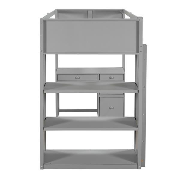 Modern Gray Twin Size Loft Bed with Desk and Storage Shelves