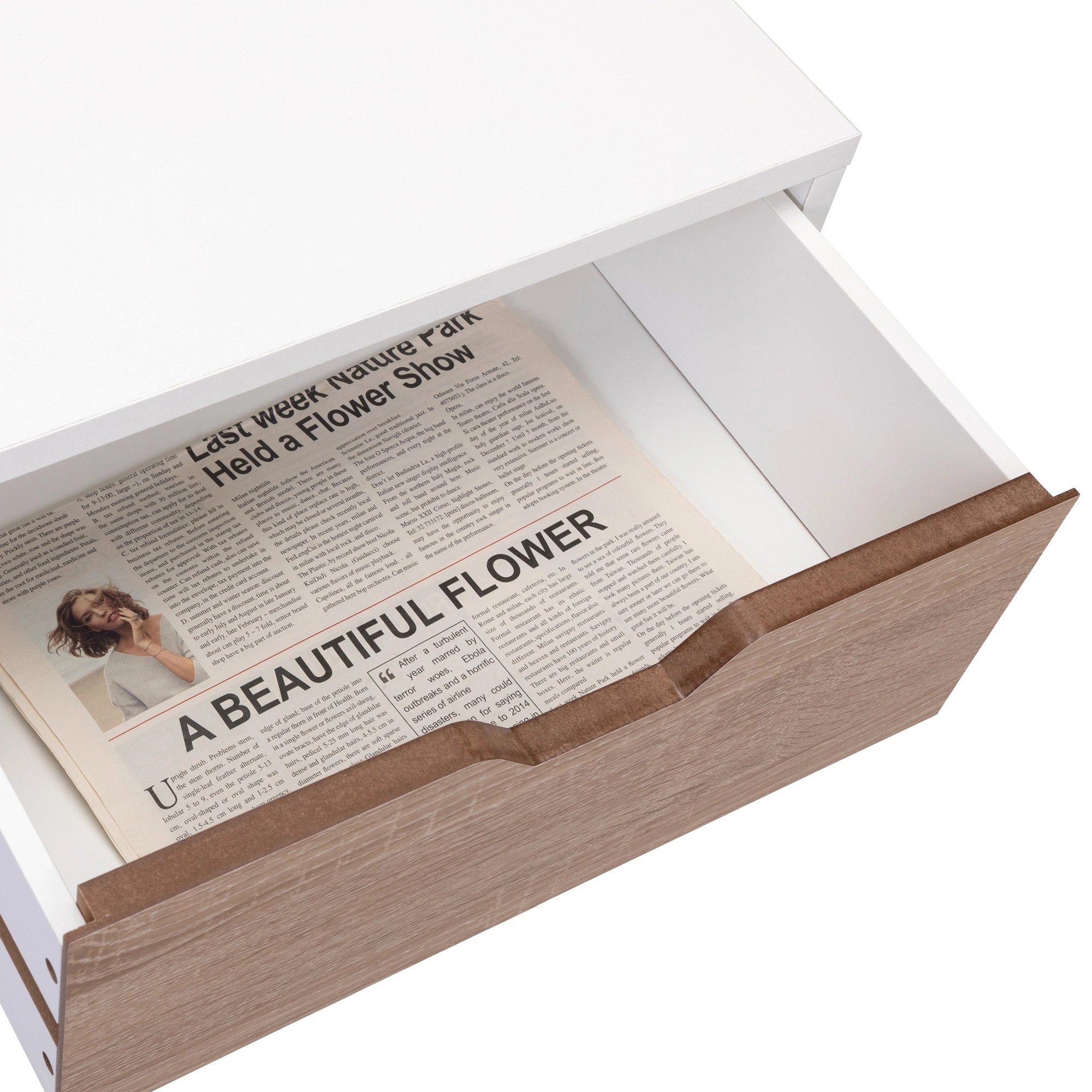 Features:[Simple Modern Design]: This bedside table has a modern design in classic black and rustic brown/white and walnut grain colors and is suitable for any style of room. This nightstand can also be used as an end side table and coffee table in the living room, hallway, or closet.[Spacious Storage Space]: The two large-capacity drawers can store books, diaries, glasses cases and other private items, making the room neat and organized. Decorations such as lamps, photo frames, plants, etc. can also be displayed on the desktop to add beauty to your room.[Solid Wood Legs]: The sofa side table has a maximum weight capacity of 66 pounds and the support legs are made of pine wood for durability. The legs with non-slip feet are arranged in a trapezoidal shape to ensure overall stability, won't scratch floors and reduce noise when moving.[High-Quality Material]:The nightstand with drawers is made of high-quality MDF board combined with a pine wood base to ensure durability and stability for long-term use. The surface is wear-resistant, waterproof and easy to clean.[Easy to Assemble and Pull]: Numbered parts labeled with corresponding instructions and detailed instructions make it easy to install this bedside table. The grooves on the drawers are hidden pulls design that is both beautiful and easy to pull. Specifications:Color: White WalnutMaterial: MDF + Solid WoodOverall Dimensions: 15.8''Lx 11.9''Wx 28.1''HDrawer Inner Size: 13.6''Lx 9.6''Wx 4.1''HWeight Capacity of Top: 66 lbsWeight Capacity of Each Drawer: 22 lbsNet Weight: 37 lbs