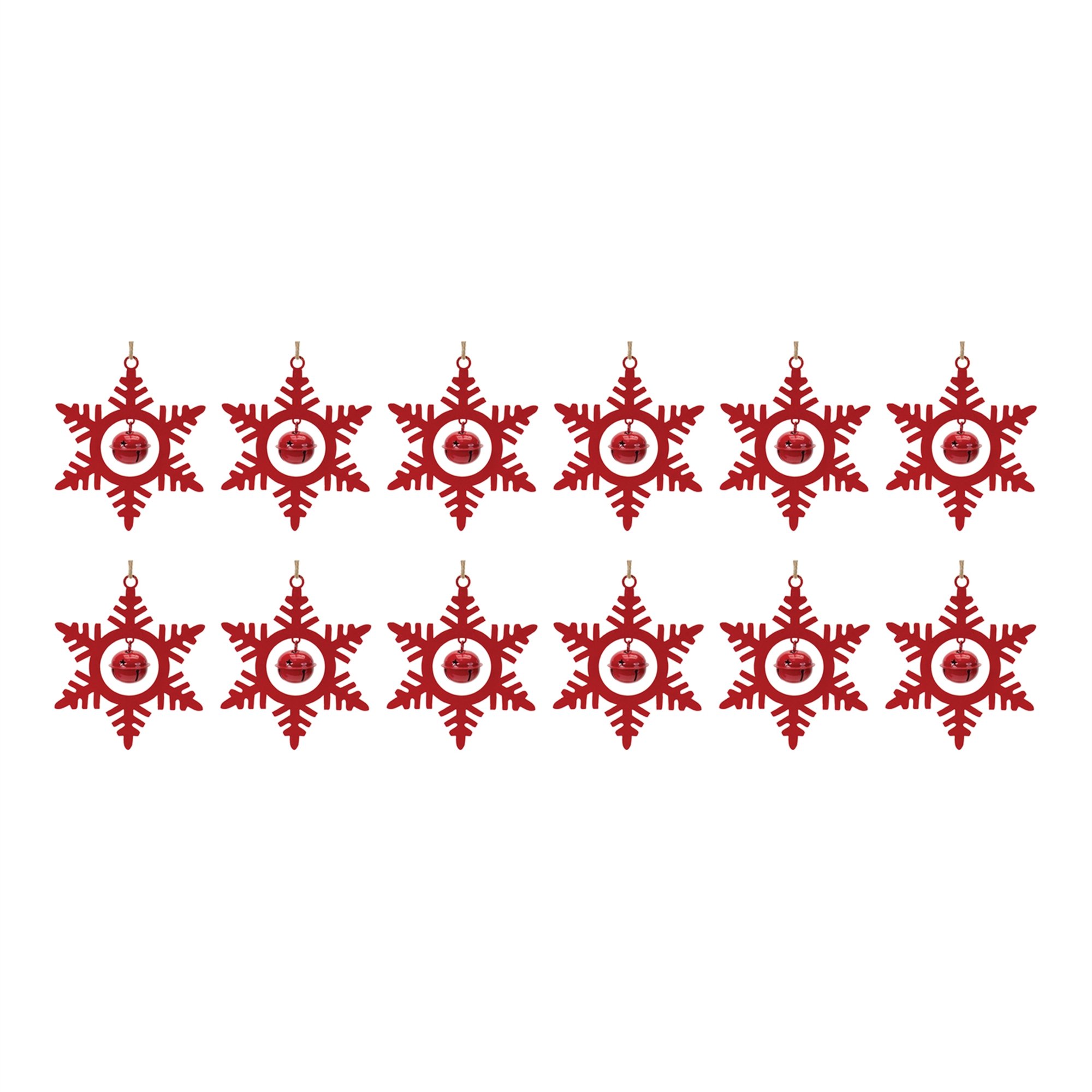 Add a traditional touch to your Christmas Tree with this beautiful set of Metal Snowflake with Bell Ornaments. Featuring 12 pieces, this set's festive red tones, traditional snowflake design, and hanging sleigh bell accents are the perfect combination to create a memorable display. The quality iron metal composition with delicate jute string hanger is sure to endure for seasons to come. Whether you're adding a touch of cheer to your home or gifting to a loved one, these ornaments will definitely bring smiles to your home.