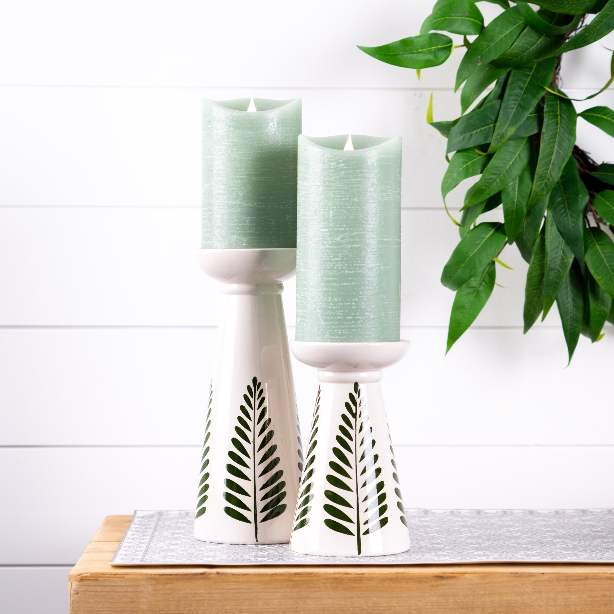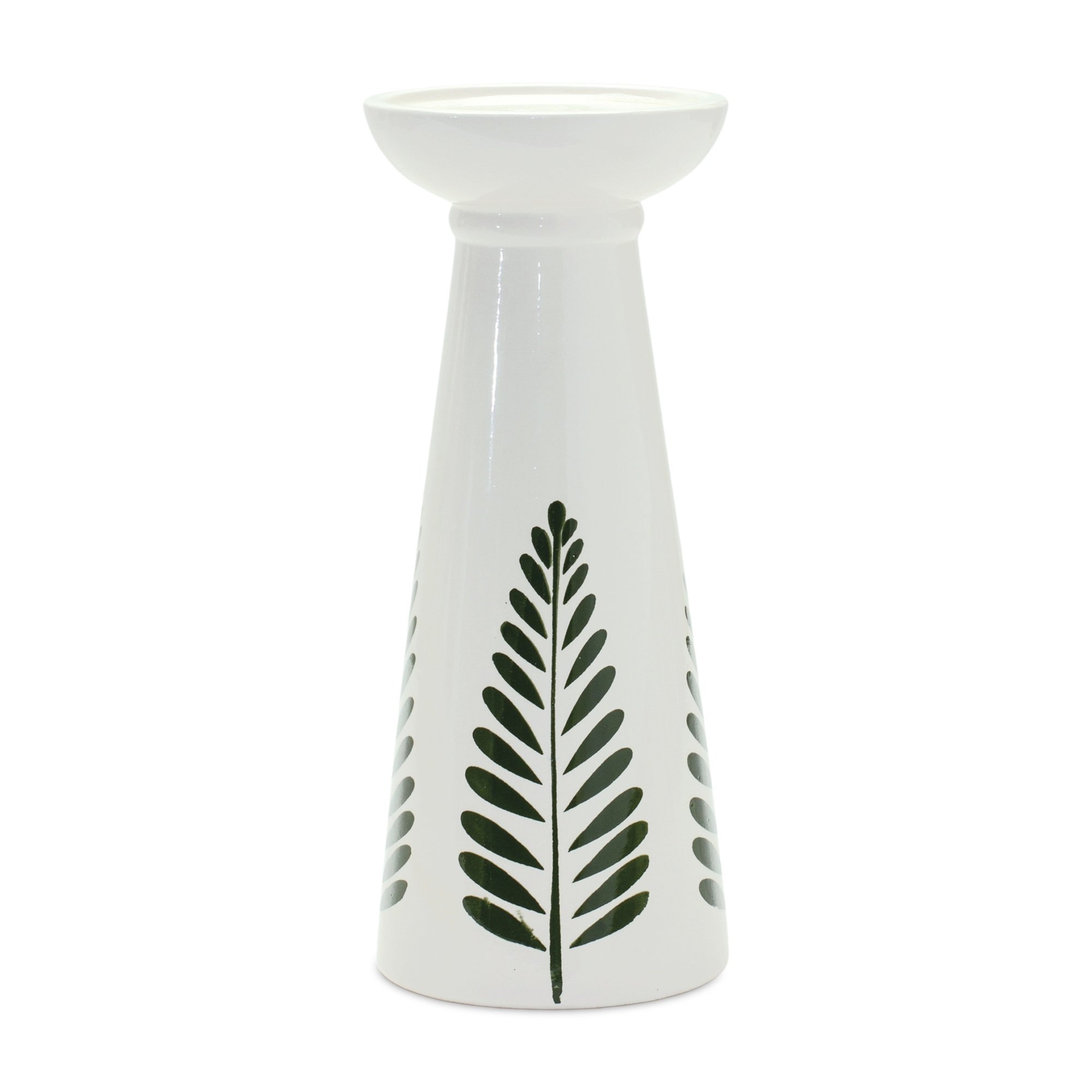 Decorate your home with this beautiful set of Ceramic Leaf Candle Holders. The modern leaf print design paired with the classic white glazed finish makes this set the perfect addition to any style of decor. The quality ceramic composition is sure to last for seasons to come. Illuminate the piece with real wax or LED candles. Candles sold separately.