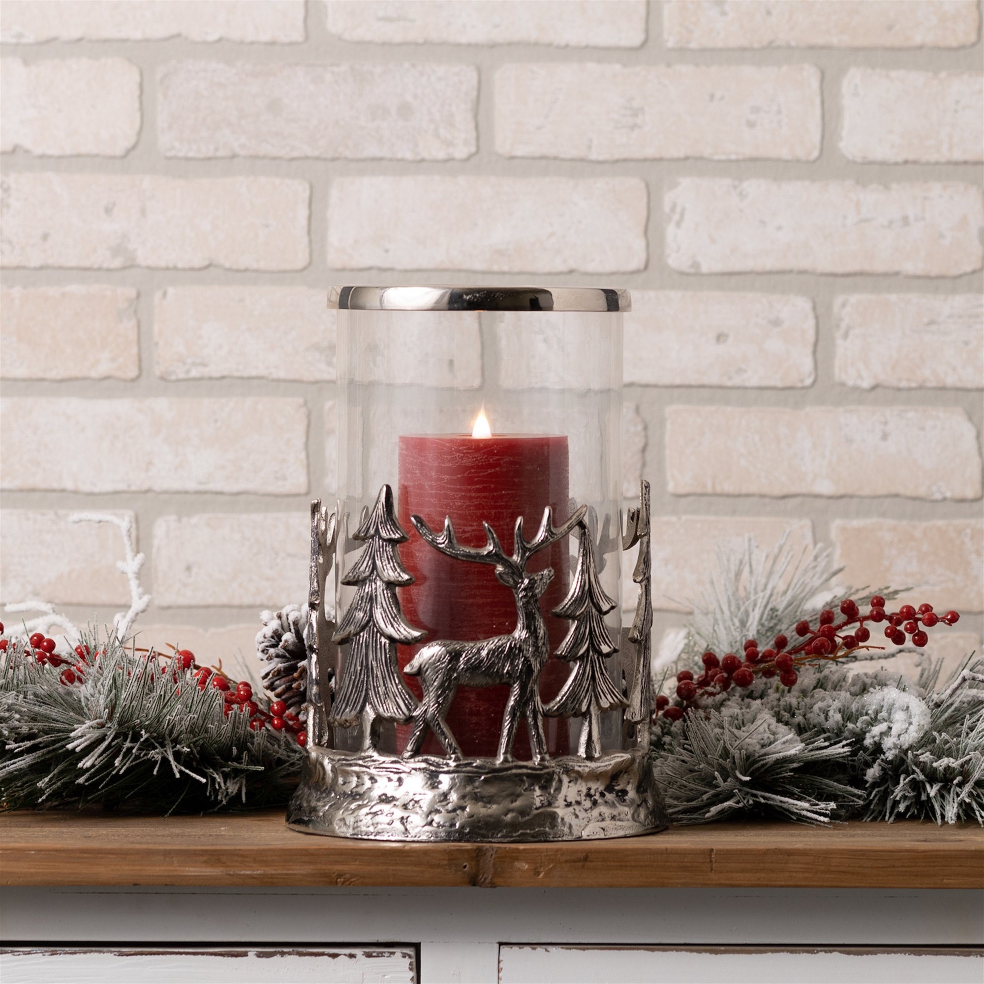 Add a touch of woodland style to your home with this Etched Metal Candle Holder. Measuring 11" tall, this piece is a great fit for your rustic or cabin lodge style of holiday decor. The etched metal design paired with the woodland deer and pine tree scene is the perfect combination to create a memorable holiday display. The quality glass and aluminum metal composition is sure to endure for seasons to come. Illuminate the display by adding a real wax or LED candle to the holder. Candles sold separately, this piece best fits a 4" or 5" pillar candle.