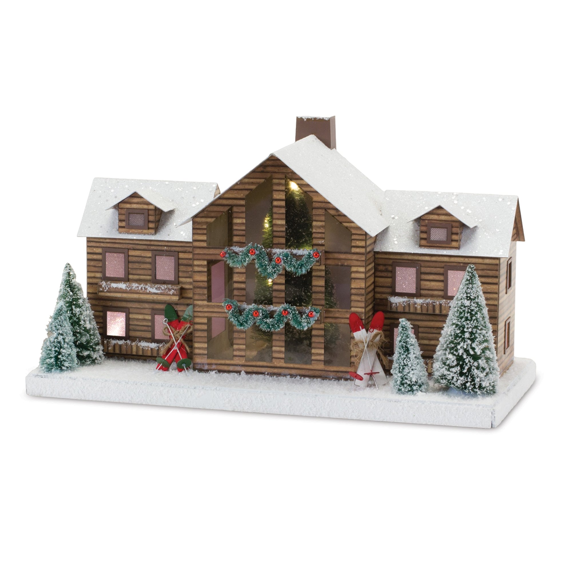 Make your holiday season extra special with this traditional Ski Lodge! This stunning lighted display features a plastic composition with a flocked snow finish, and pine tree & ski accents. Perfect for your holiday home decor or as a thoughtful gift, the traditional Ski Lodge is sure to bring holiday cheer to any room. Requires 3 AAA batteries each, not included.