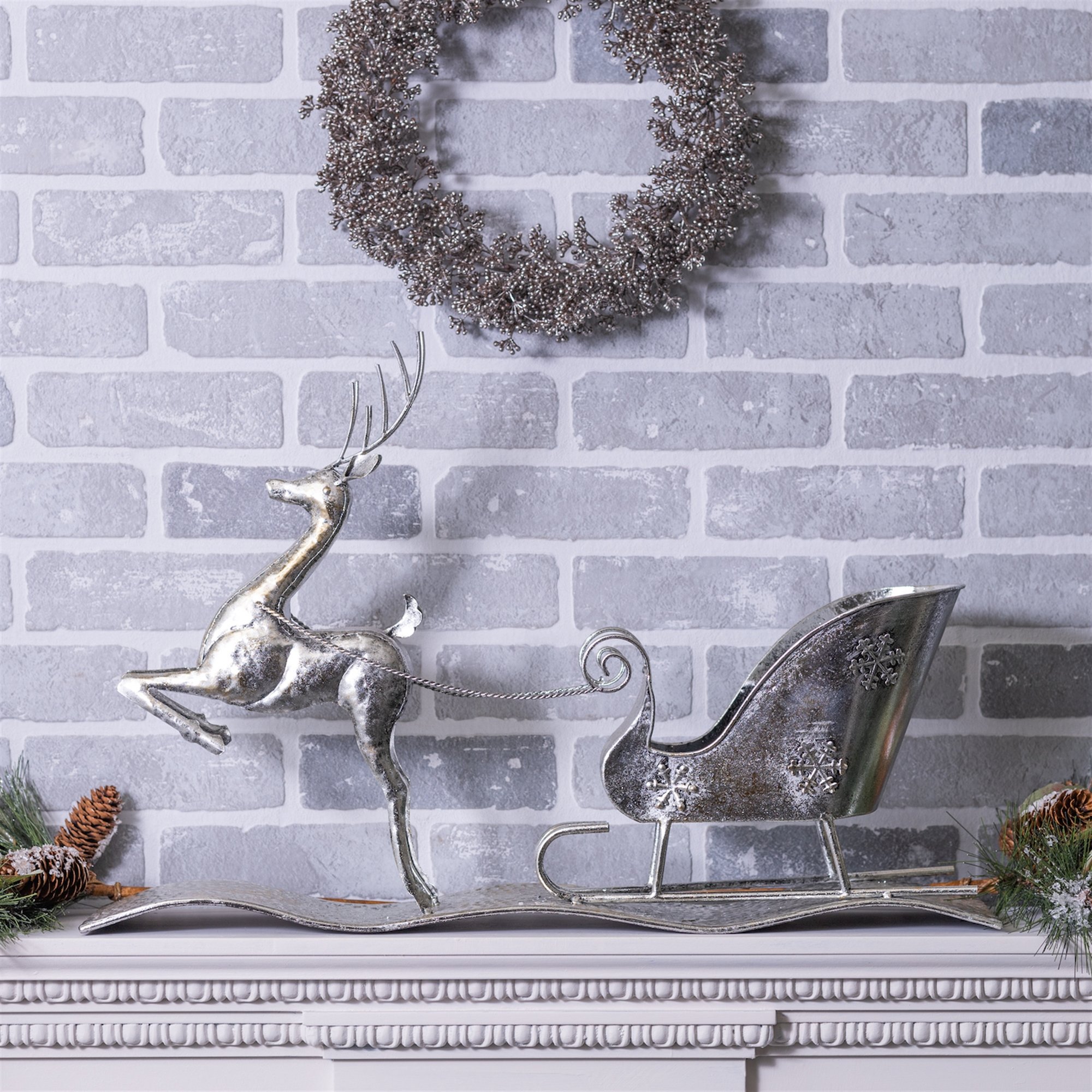 Enhance your holiday decor with this adorable Reindeer with Sleigh Display. Measuring 25.5" long, this piece is a great fit for your woodland or traditional style of decor. The chic silver and grey tones paired with the woodland reindeer design with Santa's sleigh accent are the perfect combination to create a memorable display. The quality iron metal composition is sure to endure for seasons to come. Display the piece on your mantle or tabletop display to make a statement in your home.