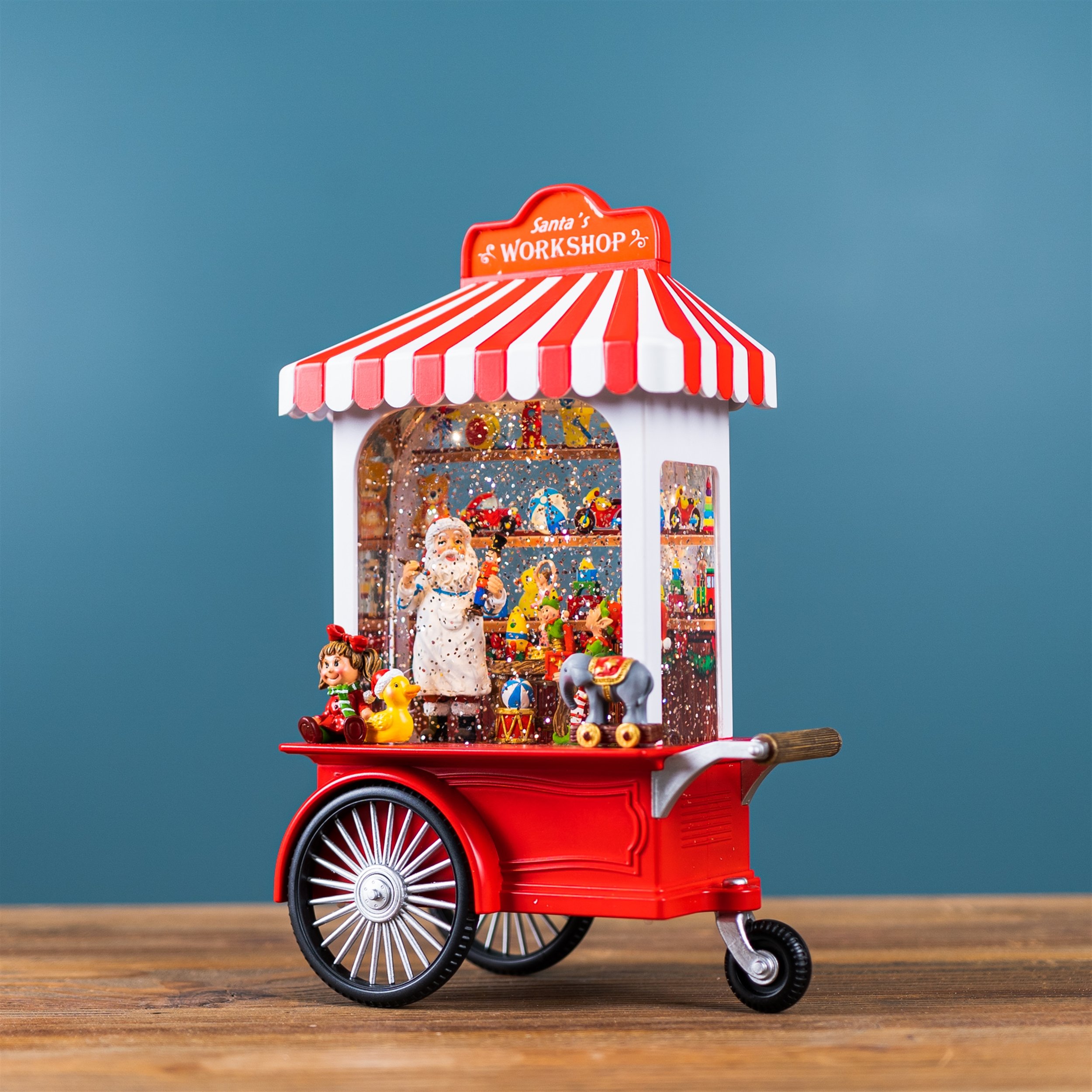 Illuminate your home this Christmas season with the stunning Lighted Snow Globe with Santa's Toy Shop Stand. This piece features Santa and elves in a toy shop cart with toys including nutcrackers, drums, teddy bears, and more. The traditional food cart stand design paired with the sparkley globe contents makes this set a great addition to any style of holiday decor. The piece also features a 6-hour timer function to save you the hassle of turning it on and off. A USB charging cord is included with purchase.