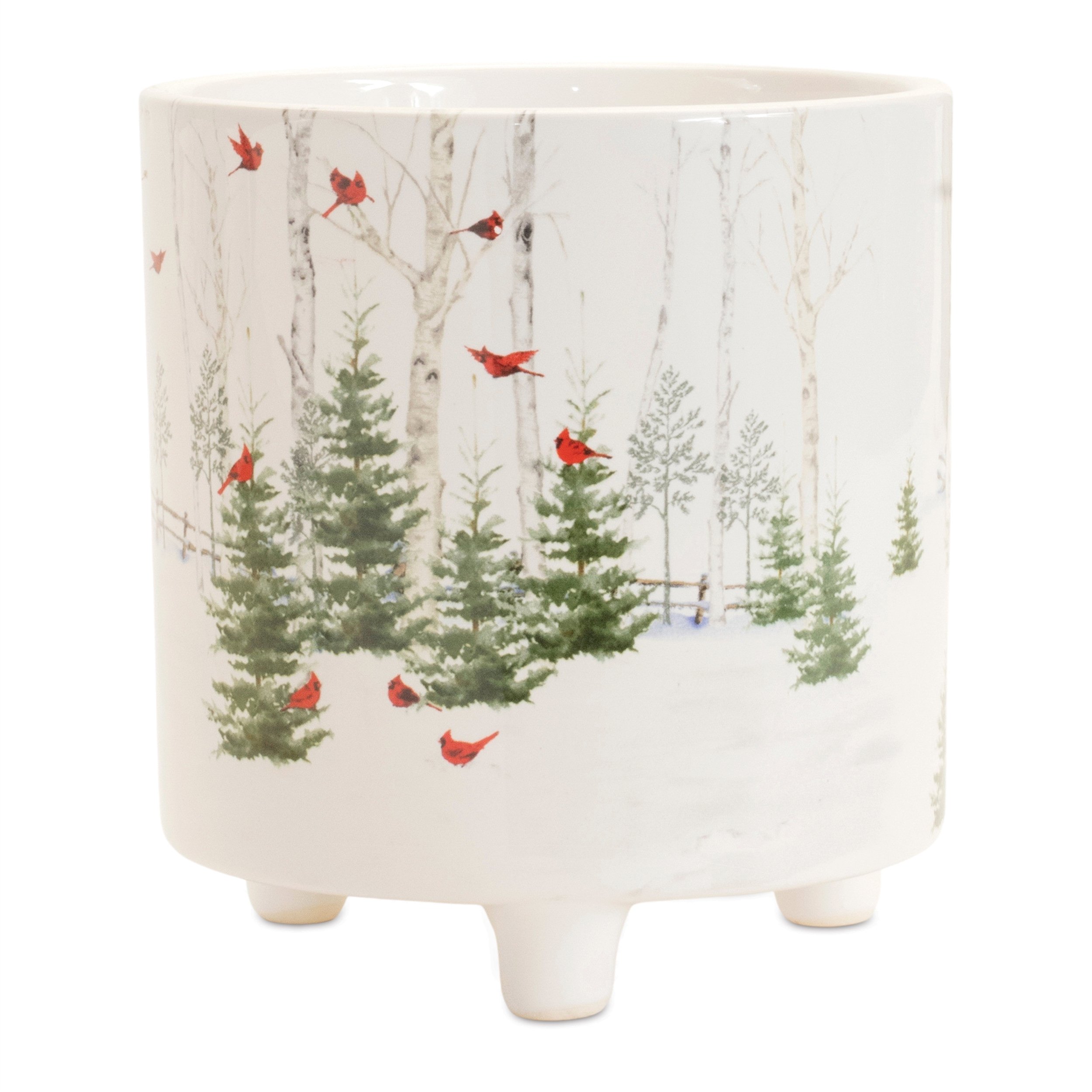 Display your holiday plants and arrangements in style with this set of Winter Cardinal Planters. Featuring two assorted sizes, this set is a great fit for your traditional or cabin rustic style of holiday decor. The wintry white, green and red tones paired with the traditional cardinal bird forest design is the perfect combination to create a memorable display. The quality dolomtie stone composition is sure to endure for seasons to come. Complete the look by adding a bunch of dried florals or holiday flowers to each planter.