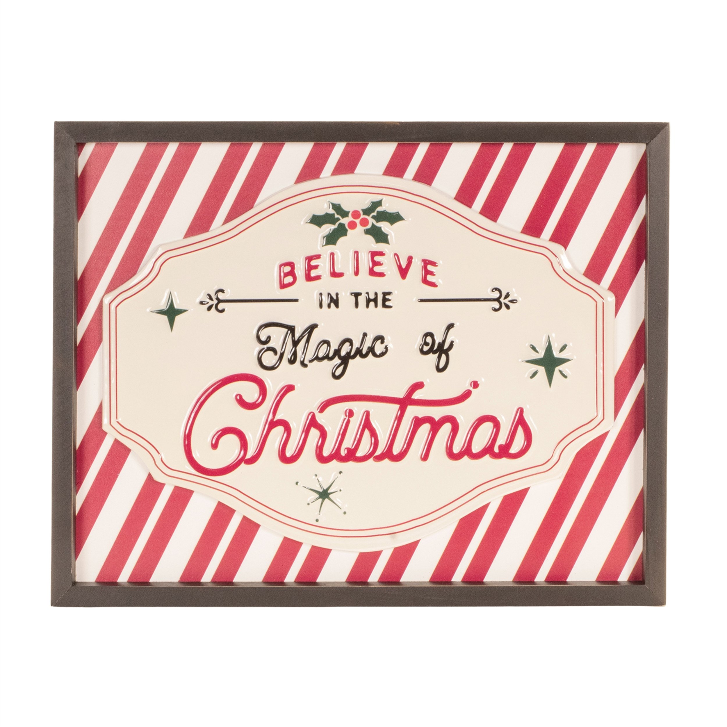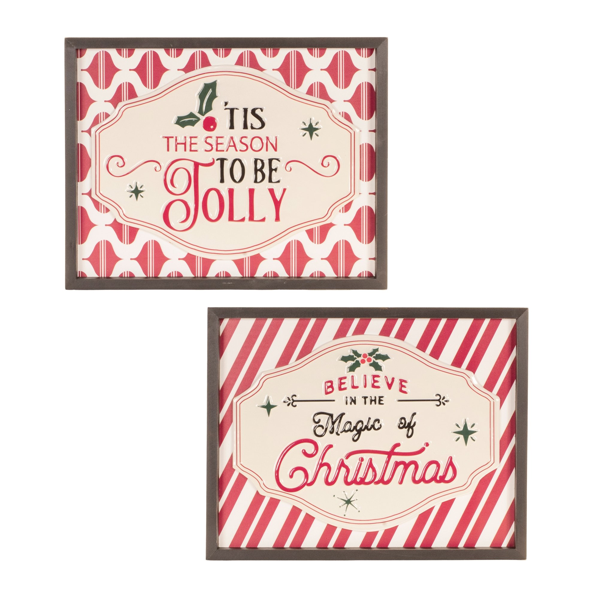 Get your home into the holiday spirit with this set of Metal Jolly Christmas Signs! This festive wall art will bring warmth and holiday cheer to any room. With its festive red and white tones and whimsical font, you can share the message of "It's the Season to be Jolly" and "Believe in the Magic of Christmas" with your loved ones. The fir wood and MDF composition ensures a durable yet lightweight piece that will last for years to come. Add some holiday cheer to your home today with Holiday Sentiment Signs!
