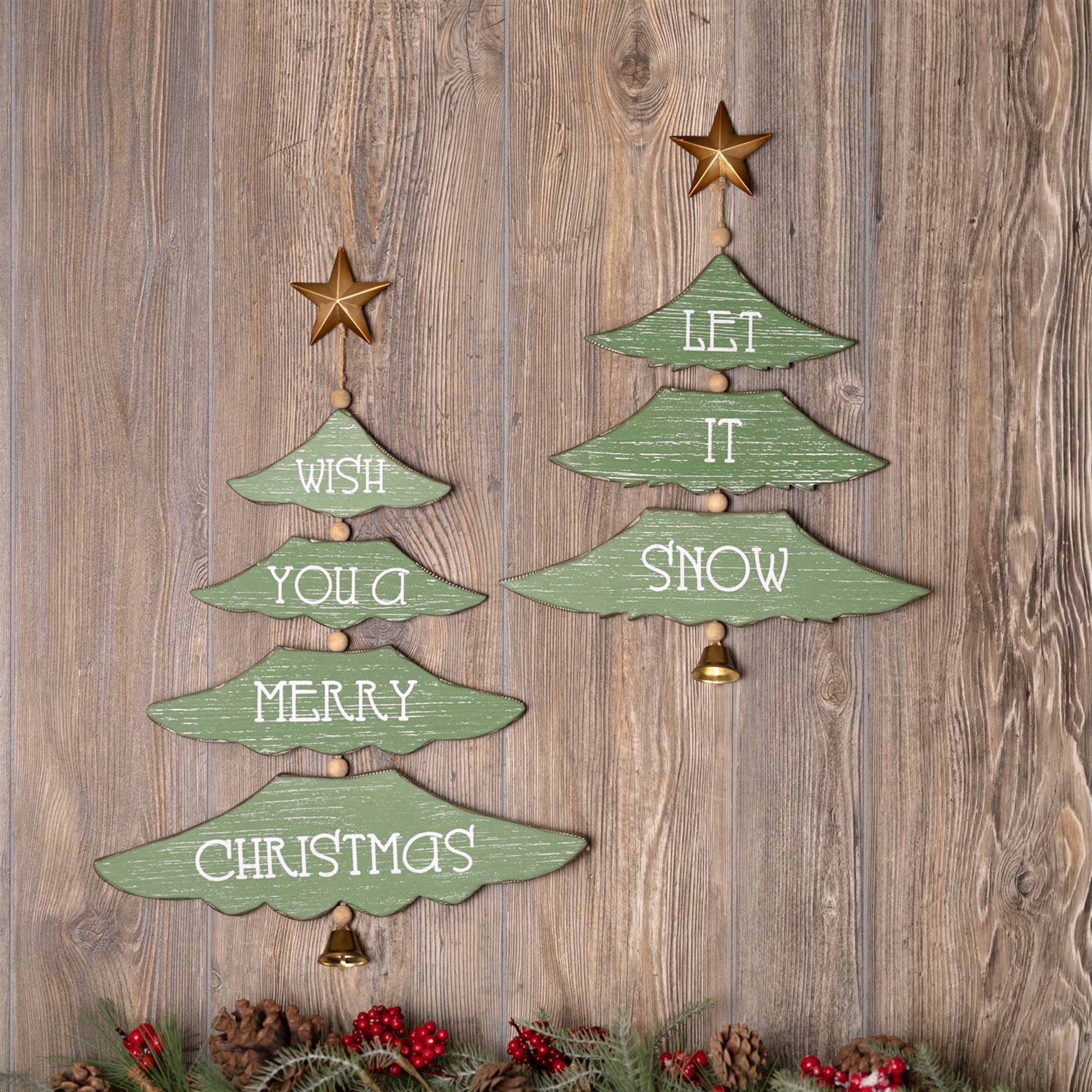 Get your home into the holiday spirit with this set of Pine Tree Christmas Signs! This festive wall art will bring warmth and holiday cheer to any room. With its festive green and gold tones and star and bell accents, you can share the message of "Wish You a Merry Christmas" and "Let it Snow" with your loved ones. The MDF wood and iron composition ensures a durable yet lightweight piece that will last for years to come. Add some holiday cheer to your home today with Holiday Sentiment Signs!