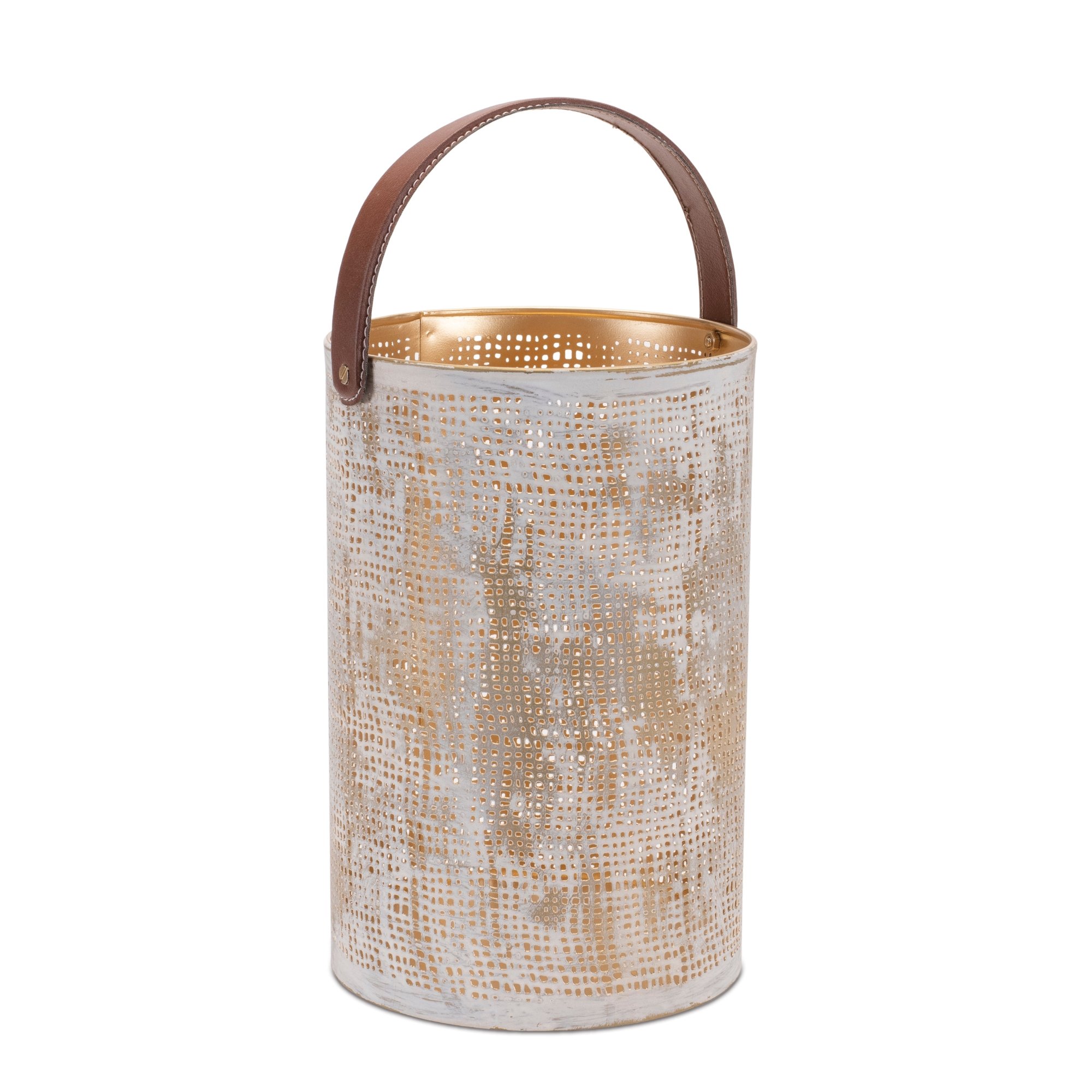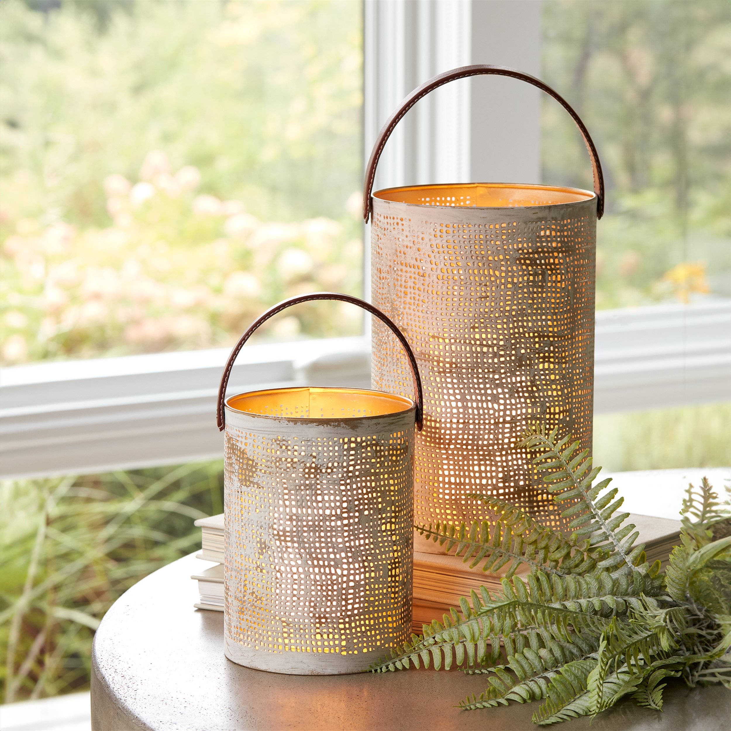 Beautify your home with this stunning set of Cut Circles Metal Lanterns. Featuring two assorted sizes, this set is sure to add an elegant and contemporary touch of style to your living space. The trendy white-washed finish paired with the abstract cut-out design with chic gold inside accent is the perfect combination to make a timeless piece. The quality iron metal composition with leather handle is sure to endure for seasons to come. Great for both every day and holiday decor, just add a set of real wax or LED candles to illuminate the display.