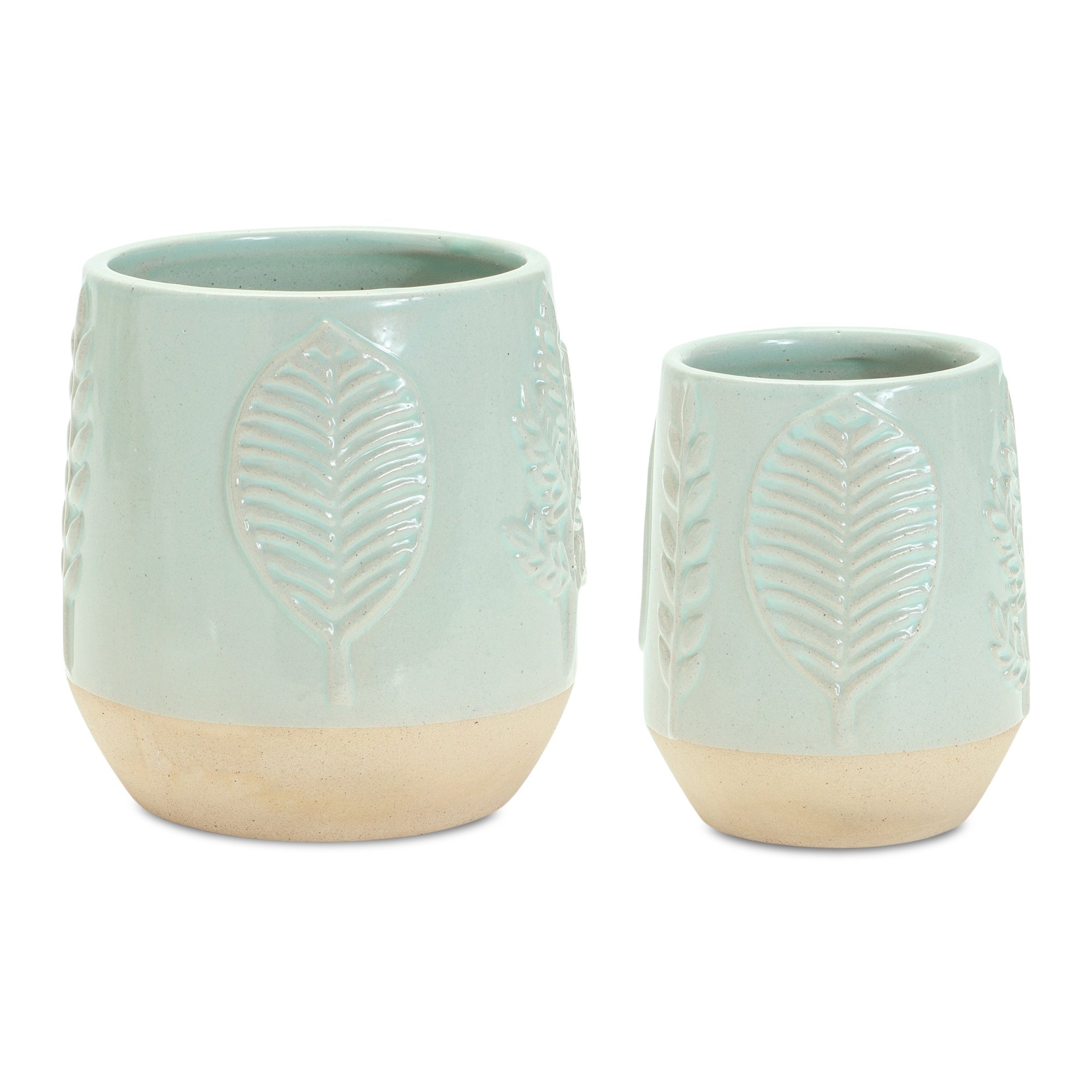 Display your indoor plants in style with this beautiful Porcelain Pot. Featuring four pieces, this set is sure to fit in with any style of home decor. The cool mint and beige tones paired with the foliage design is the perfect combination to create a stunning display. The quality porcelain composition is sure to last for seasons to come. Complete the look by adding a potted plant or bunch of dried florals to each pot.