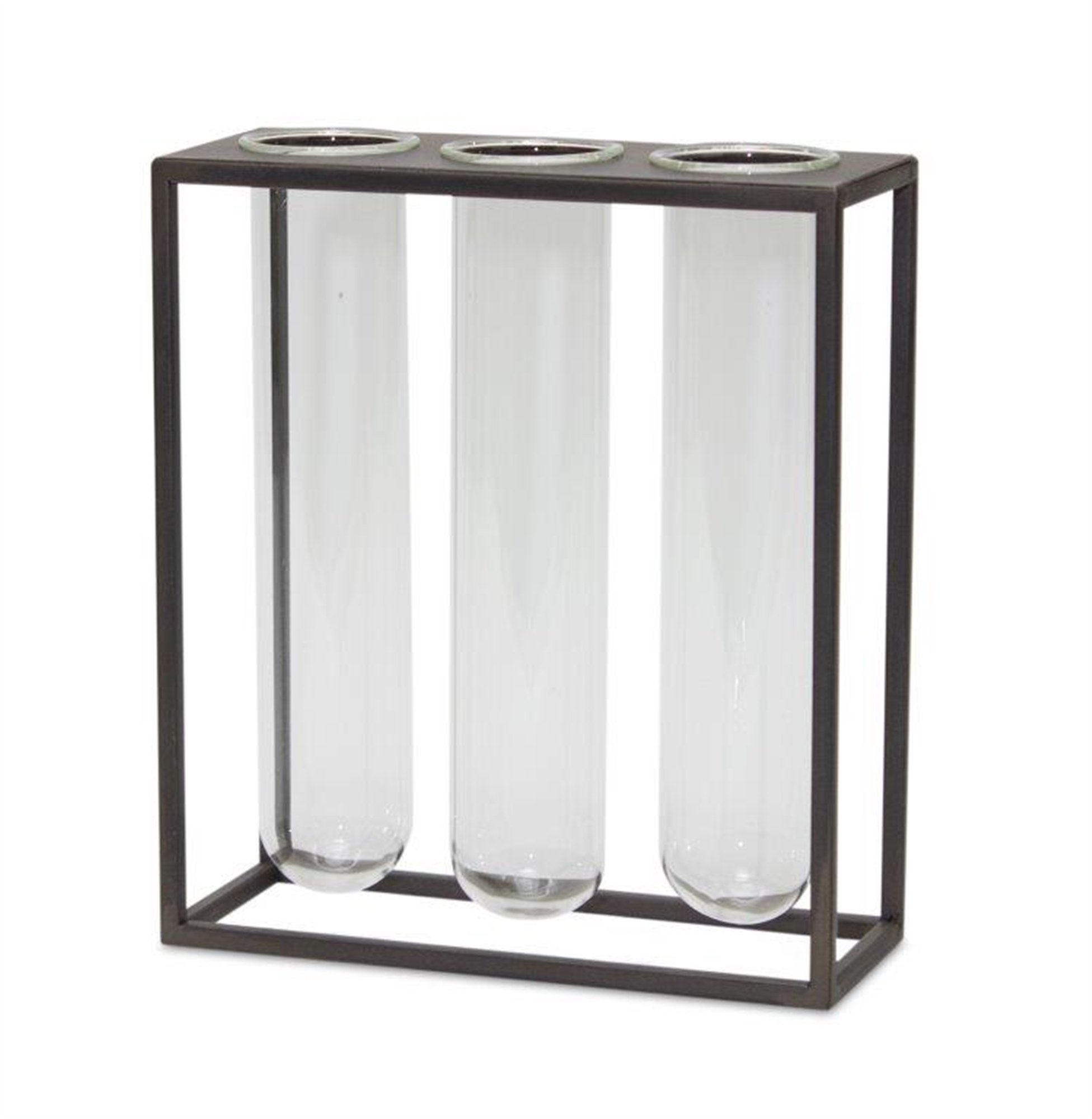 Great for displaying fresh cut floral buds from the garden or an elegant faux floral stem, this set of Triple Glass Vial Vases in Metal Stand is the perfect addition to your home decor. The rustic brown frame paired with the delicate glass vial inserts is the perfect combinaton to create a beautiful spring display. Just add a few floral stems to complete the look.