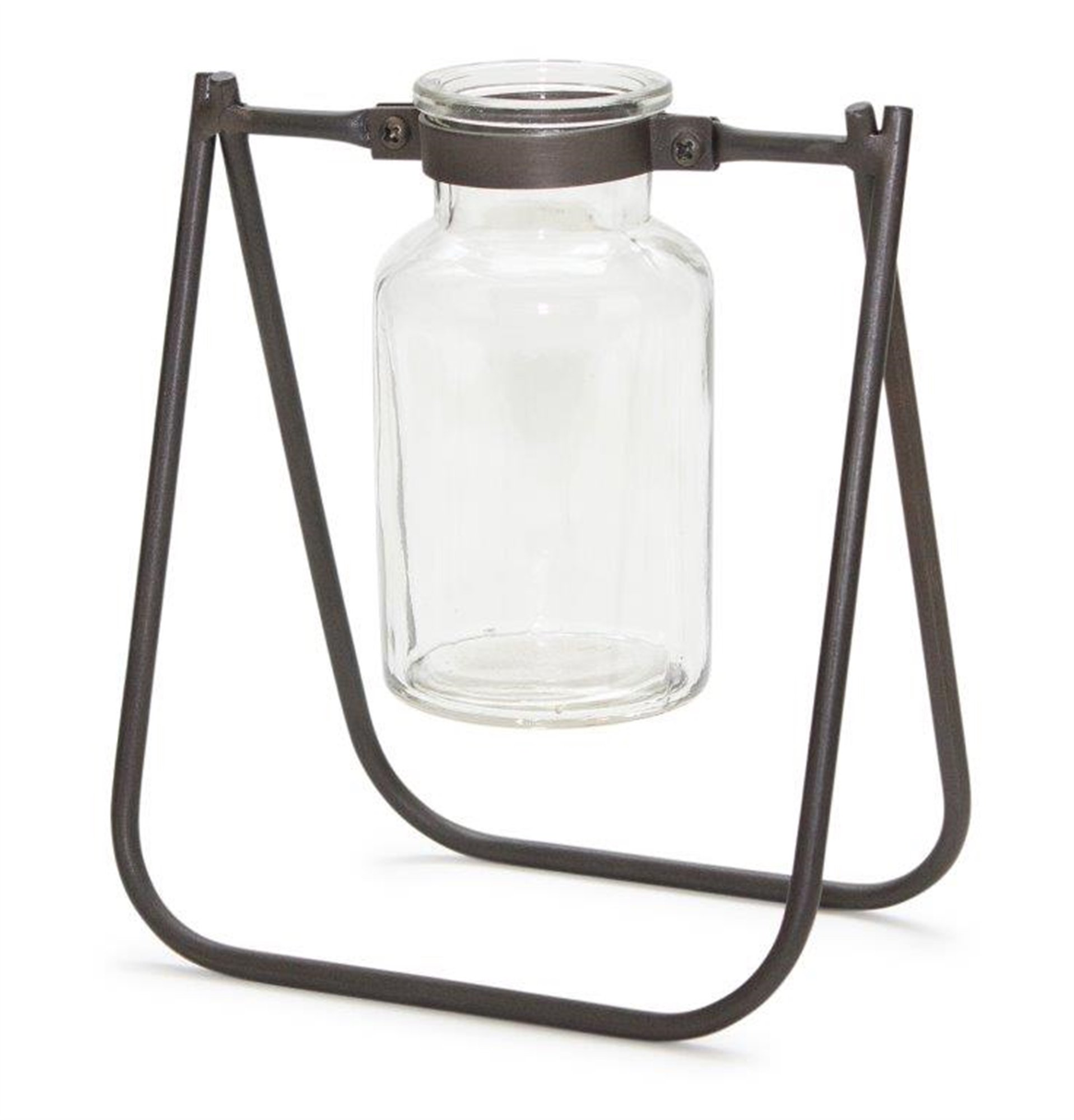 Great for displaying fresh cut floral buds from the garden or an elegant faux floral stem, this set of Hanging Jar Vase with Stand is the perfect addition to your home decor. Featuring a antique-looking frame stand, the rustic brown finish paired with the delicate glass jar inserts is the perfect combinaton to create a beautiful piece. Just add a few floral stems to complete the look.