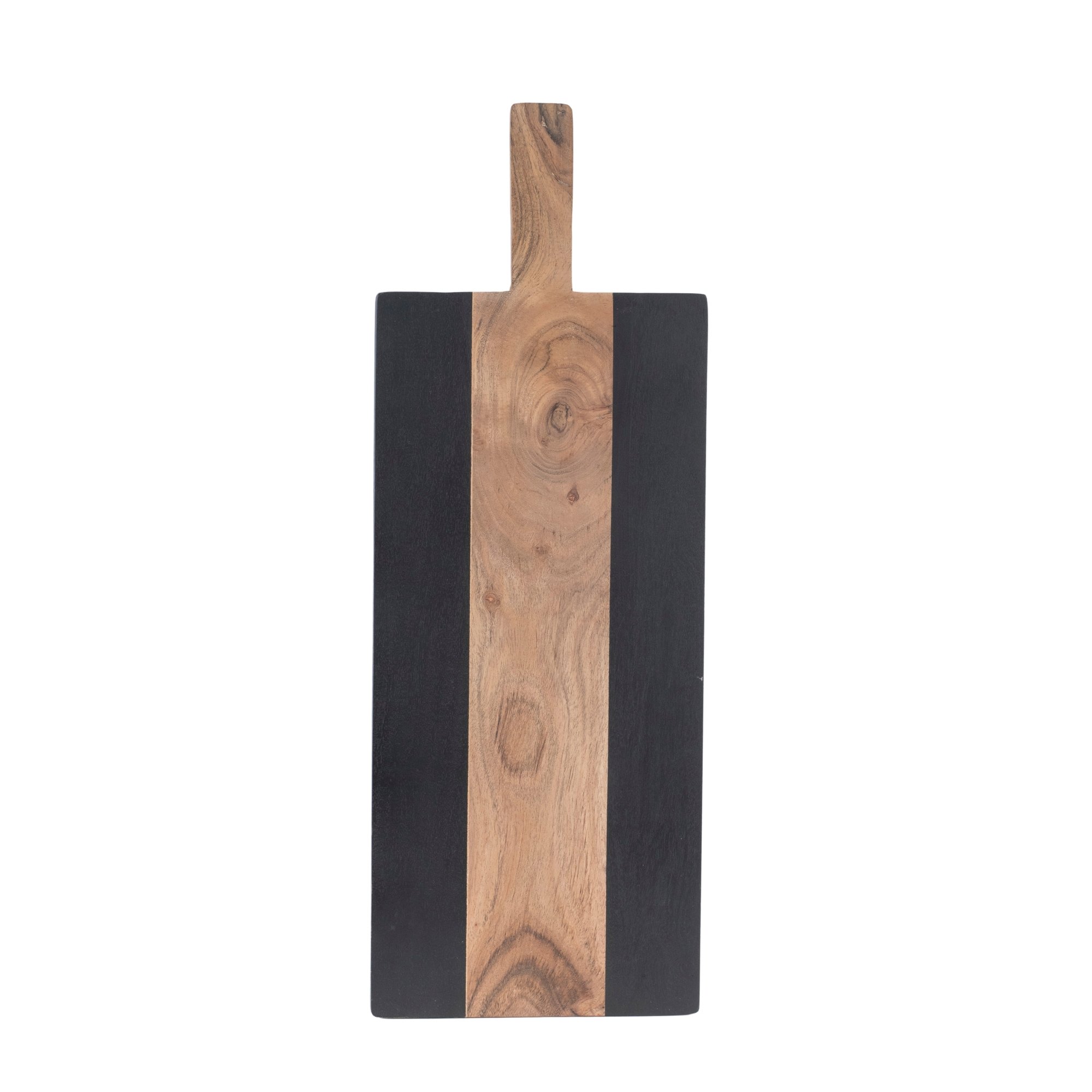 Serve your guests in style with a stunning Wood Charcuterie Board. Measuring 22" long, this piece is a great accent for your farmhouse or Scandinavian style of kitchen decor. The natural brown tones paired with the rustic wood grain finish and modern black accent is perfect to create a memorable display. The quality solid wood composition is sure to endure for seasons to come. Use this piece at your next get-together to serve an array of fruits, cheeses, meats, desserts, and more! Hand wash and dry only.