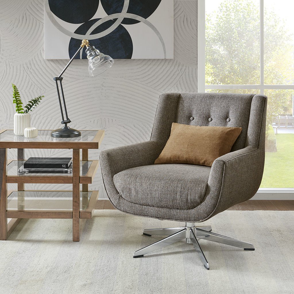 INK+IVY's Nina Swivel Lounge Chair offers a rich blend of style and comfort to update your home. The modern wing-style back features button tufting that adds a subtle yet elegant accent to the design. A 5-point star base, in a chrome finish, complements the rich grey upholstery, for a modern flair to the mid-century design. Perfect for the home office or living room, this swivel lounge chair provides comfortable plush seating and introduces a sophisticated allure to your decor. Base assembly is required.