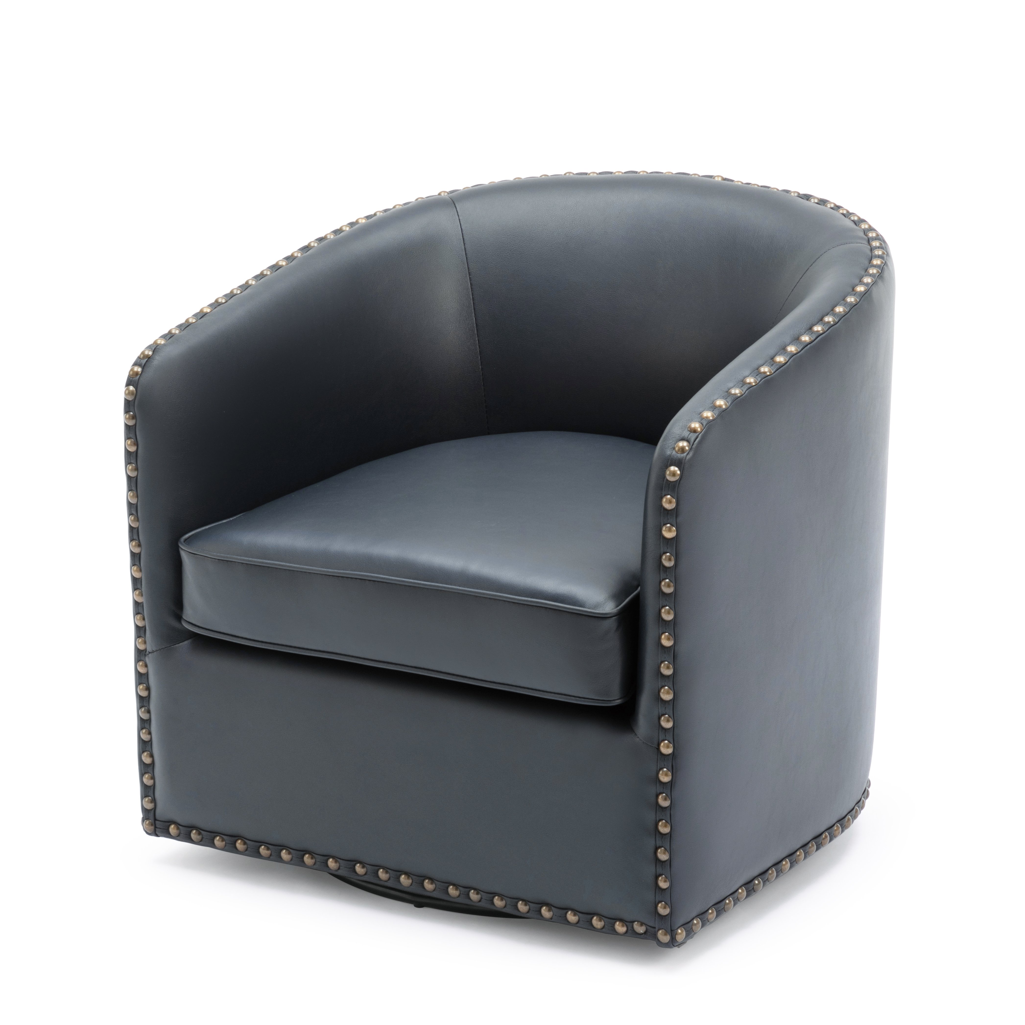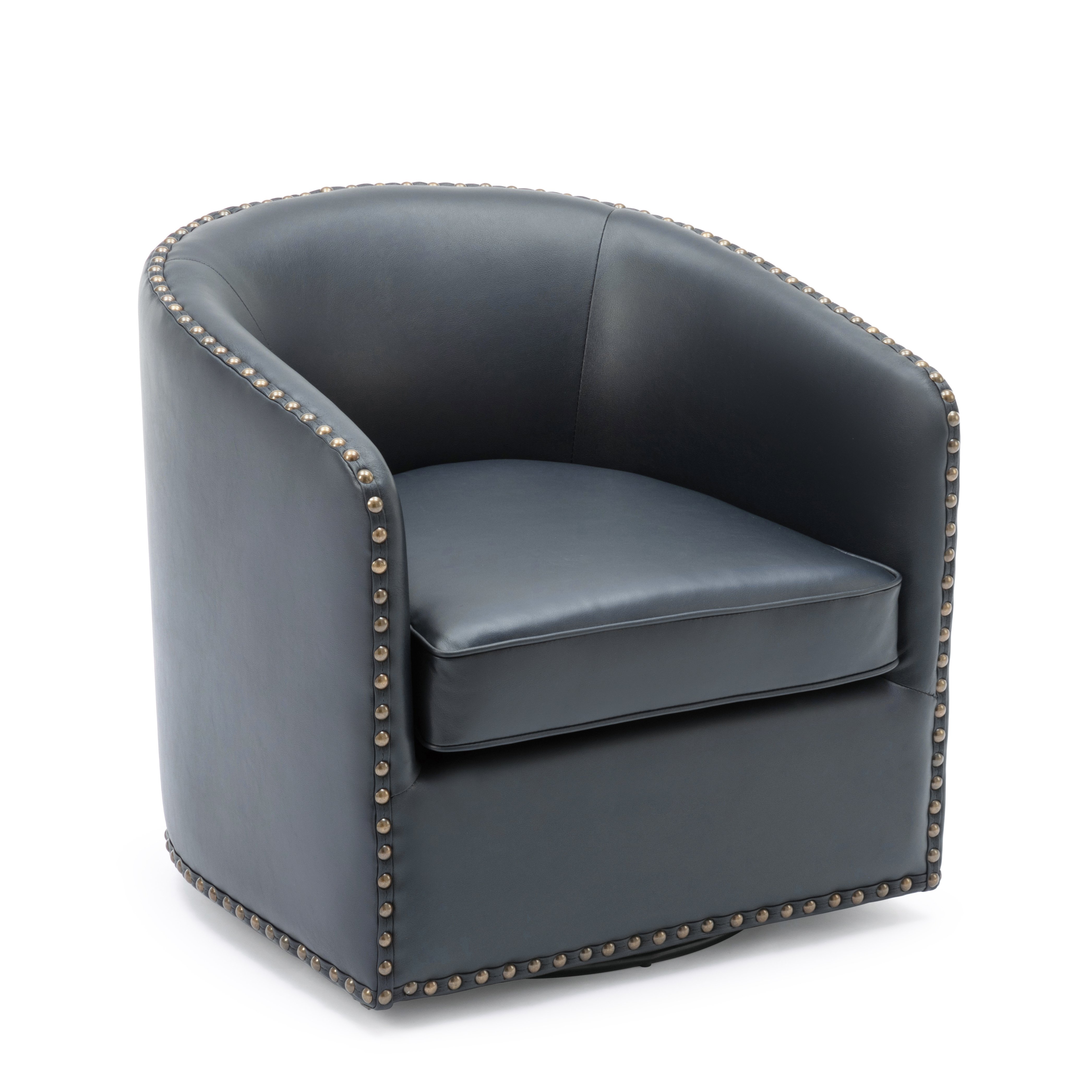 Make a statement with the classy, yet bold, Trenton Swivel Arm Chair. The 360° swivel allows versatile seating for your room, with pocketed seat springs and high density foam cushion for your comfort. Upholstered in a luxurious faux leather, the leather gel technology gives the look and feel of top grain leather and is easy to maintain. Accented by well appointed antique bronze nail head trim, the Trenton is the perfect addition to your space. Available in Midnight Blue, Camel, Caramel or Milky.